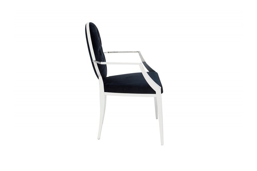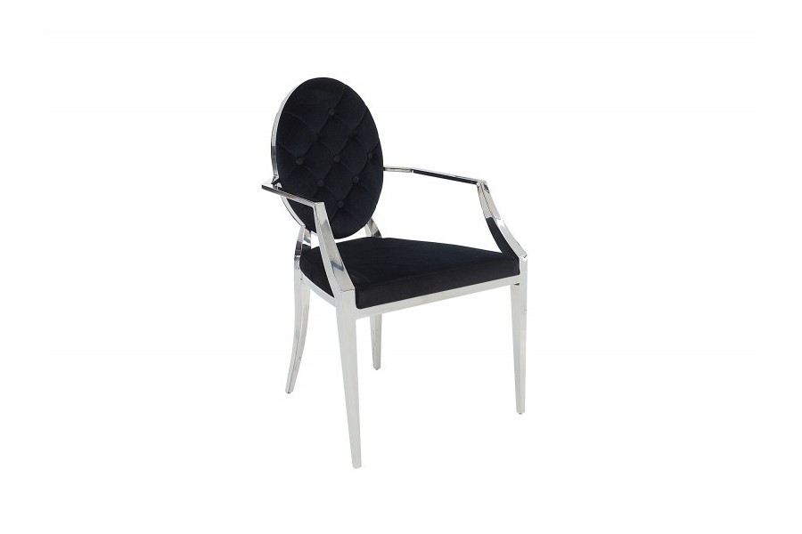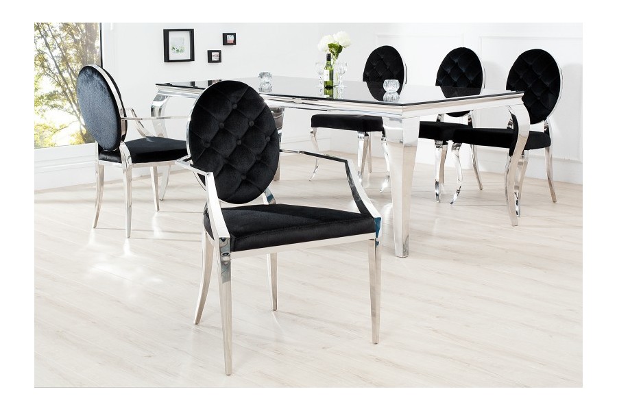 Magnifique chaise moderne coloris noir et argenté ! Fabriquée en velours de haute qualité montée sur structure en acier inoxydable solide et résistant et dotée de 2 accoudoirs pour vous offrir un confort optimal ! Elle est très élégante avec un design baroque authentique et sophistiqué et des coloris sobres et tendance !