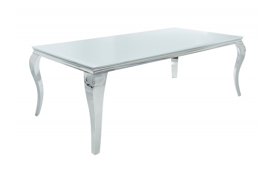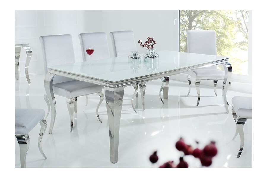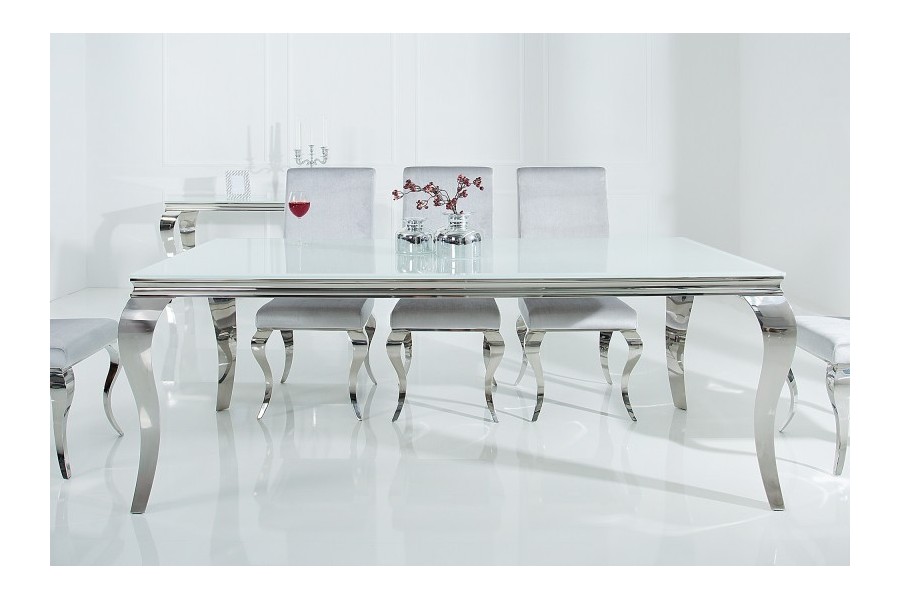 Table à manger design baroque de 200cm coloris blanc argenté en verre trempé et acier inoxydable