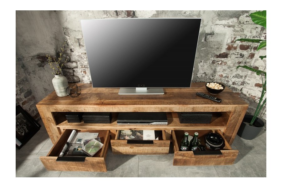 Ce meuble TV bois de manguier massif respire l'élégance naturelle ! Contenant un grand espace de rangement grâce au compartiment de rangement ouvert et aux trois tiroirs