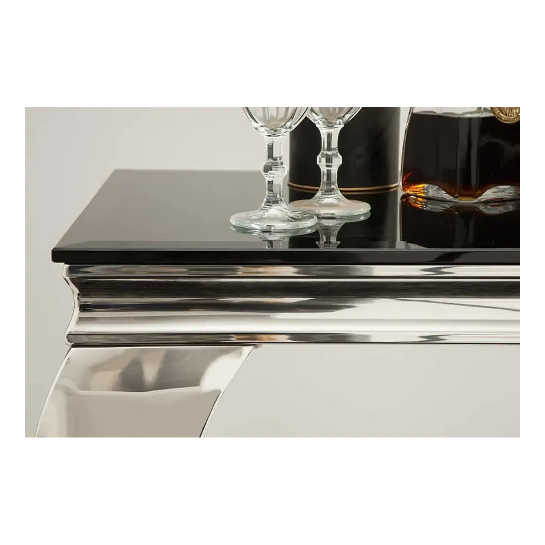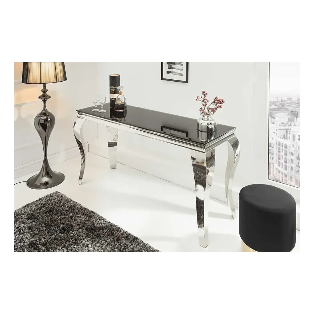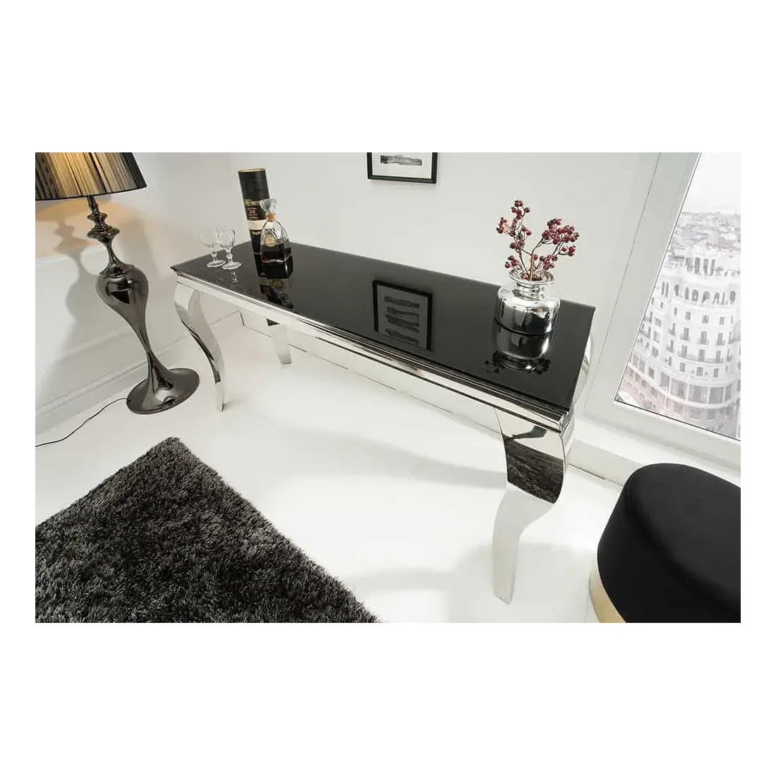 Console élégante MODERN BAROCK 145cm verre opale noir pieds en acier inoxydable