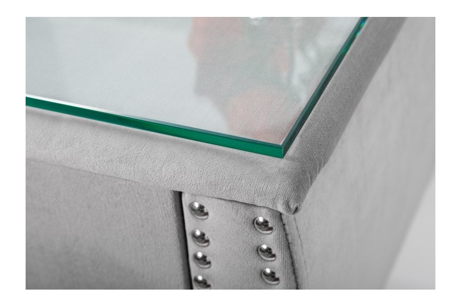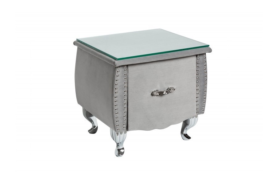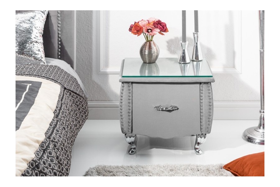 Table de chevet extravagante pompeuse avec tiroir spacieux au design baroque ! Fait en microfibre grise très durable et insensible . La plaque de verre affine en outre le coffre de nuit !