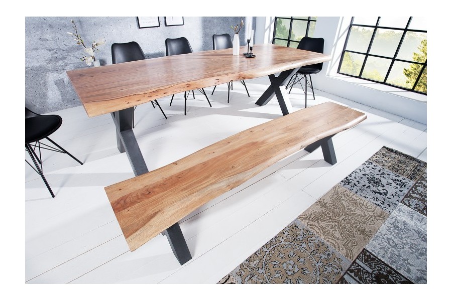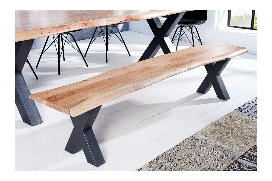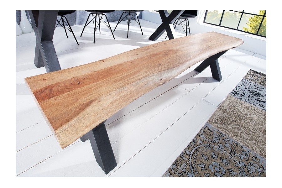 Un banc en bois d'acacia naturel, avec des pieds en métal noir.