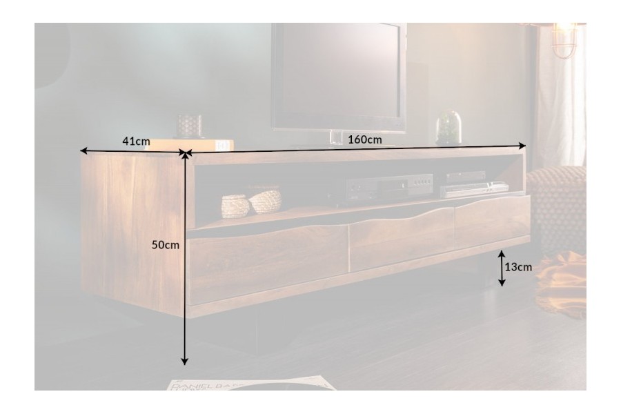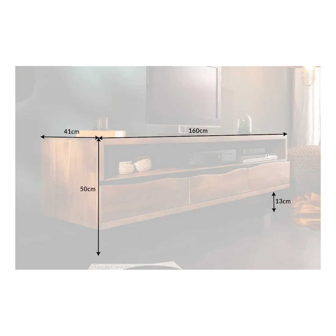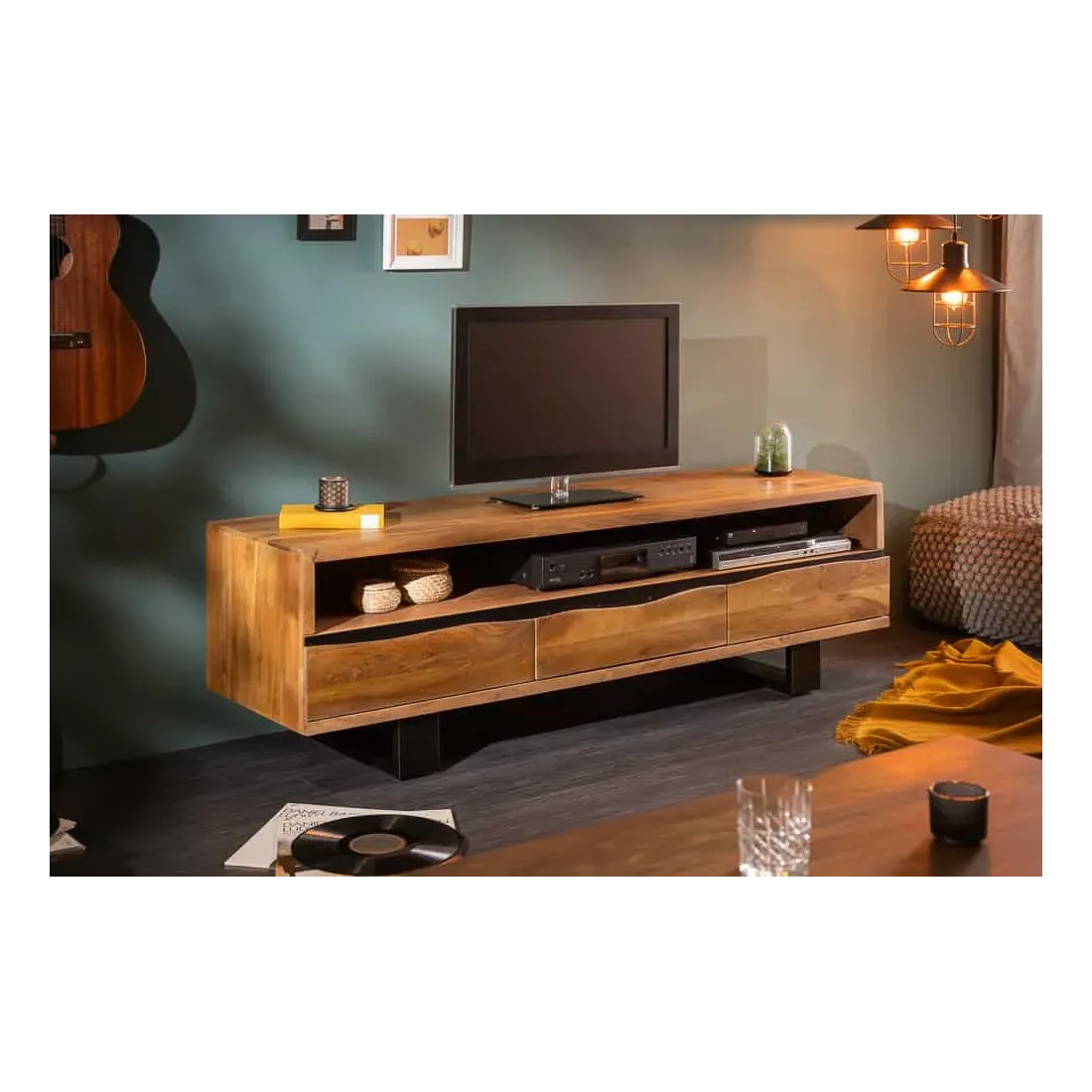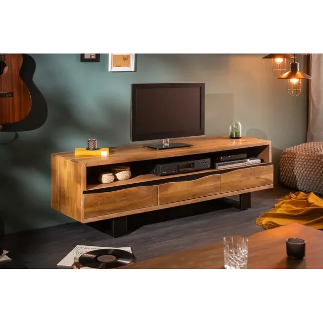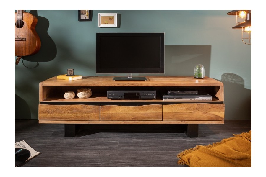 Ce meuble TV en bois massif de 160 cm de largeur est le parfait compromis entre esthétisme et praticité. Conçu en bois d’acacia verni, l’un des bois les plus durables au monde, il séduit par sa robustesse et son authenticité.