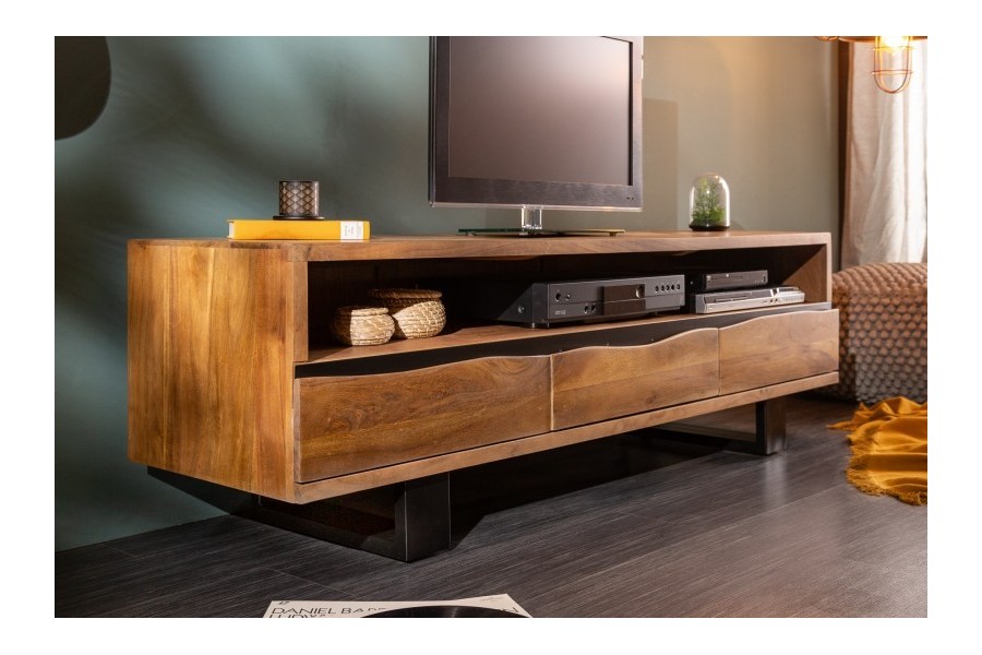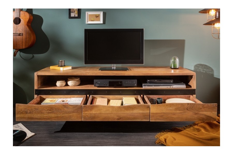 Un meuble TV au charme naturel qui allie élégance, solidité et espace de rangement pratique.