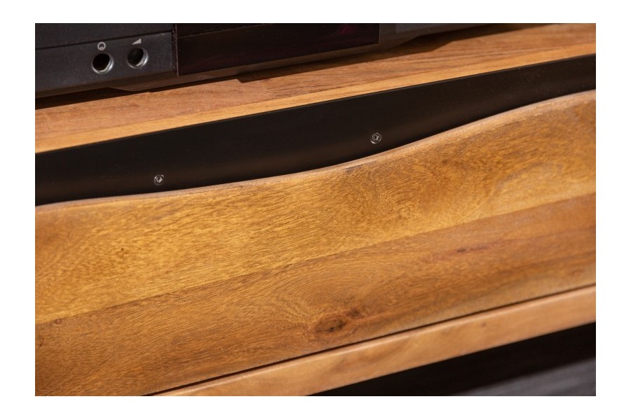 La finition miel révèle avec élégance le grain naturel du bois et souligne son aspect chaleureux et artisanal. Les applications noires en métal contrastent harmonieusement avec le bois, offrant une allure contemporaine idéale pour un salon moderne ou industriel.