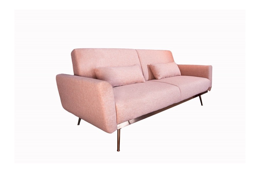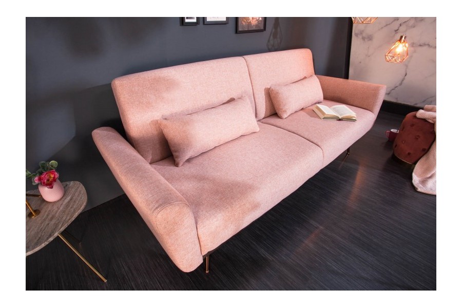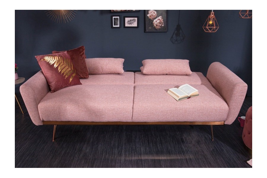 Magnifique canapé convertible élégant design rétro ! revêtu en tissu de haute qualité coloris vieux rose, avec piètement en métal solide coloris cuivre ! doté d'une assise moelleuse ainsi que des accoudoirs pratiques pour s’installer dans le confort ! ce canapé est facile à déplier et à replier, il sera parfait pour faire office de couchage d’appoint.