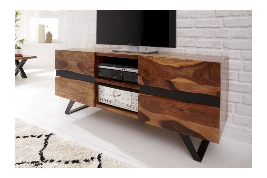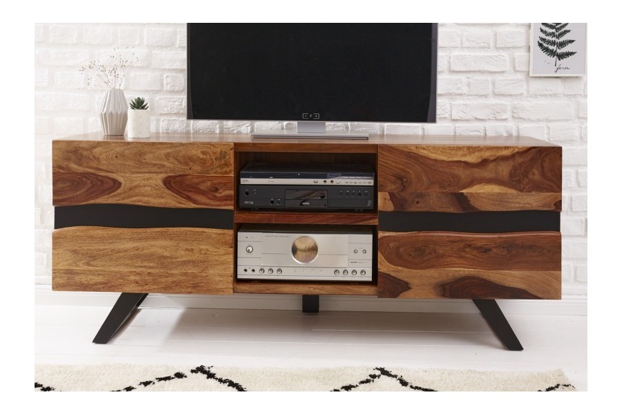 Laissez-vous séduire par le style industriel avec ce magnifique meuble TV ! doté de 2 portes et 2 compartiments, ce qui vous permet un rangement élégant ! Fabriqué joliment à la main en bois massif avec un bord d'arbre naturel et un piètement en métal solide coloris noir !