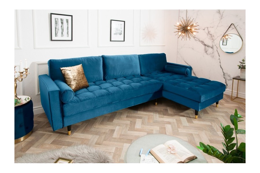 Laissez-vous charmer par ce magnifique canapé d'angle pour un confort inégalable ! Grâce à son côté d’angle réversible, trouvera aisément sa place dans votre intérieur ! revêtu soigneusement en velours de premier choix de belle couleur bleue foncée, avec une assise moelleuse capitonnée et un piétement robuste en bois massif laqué !
