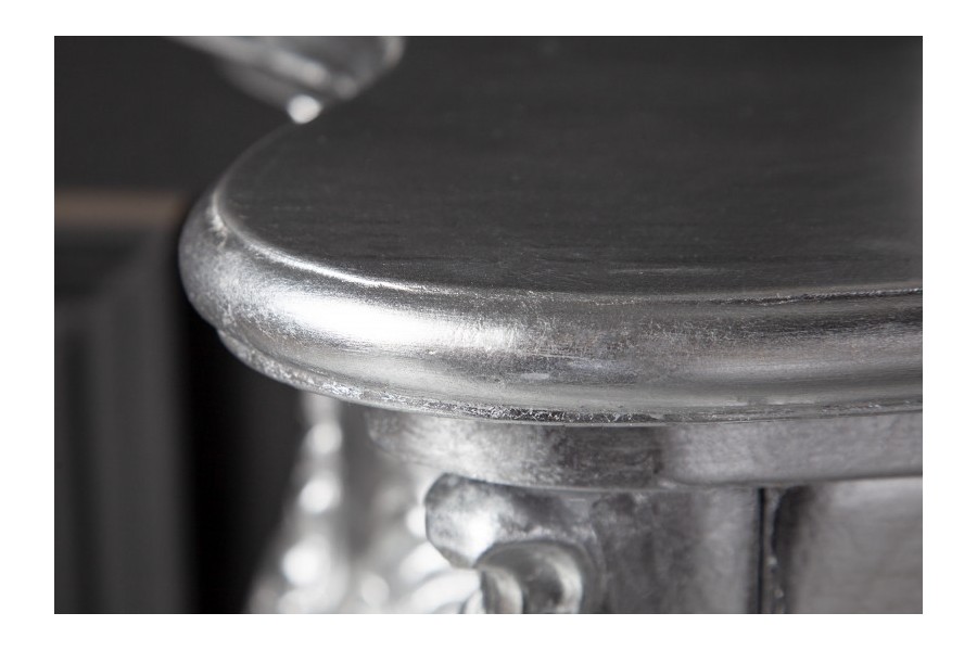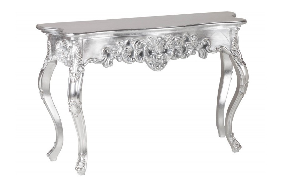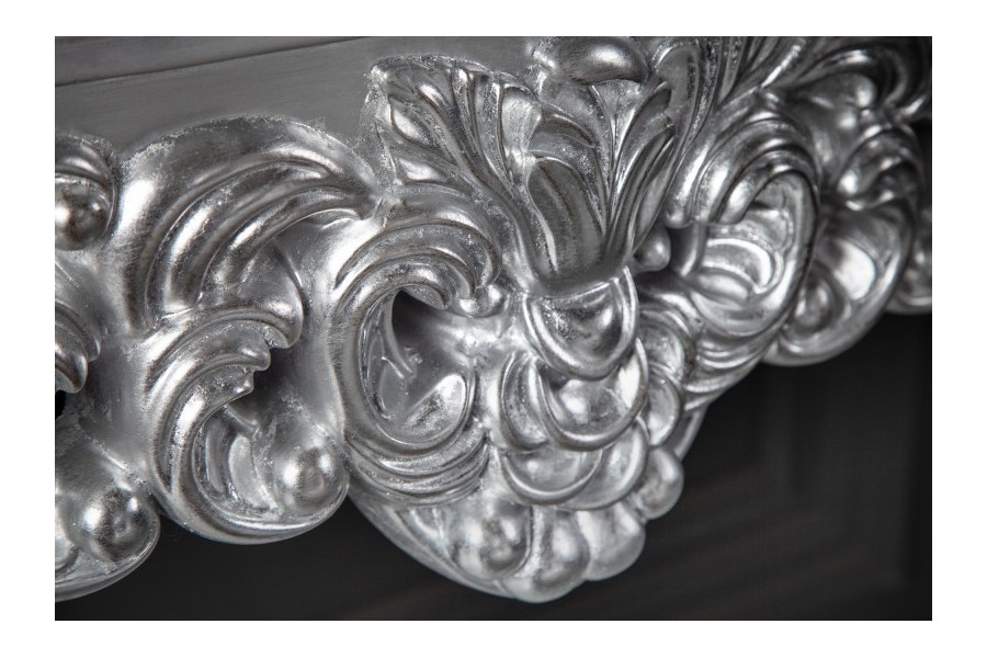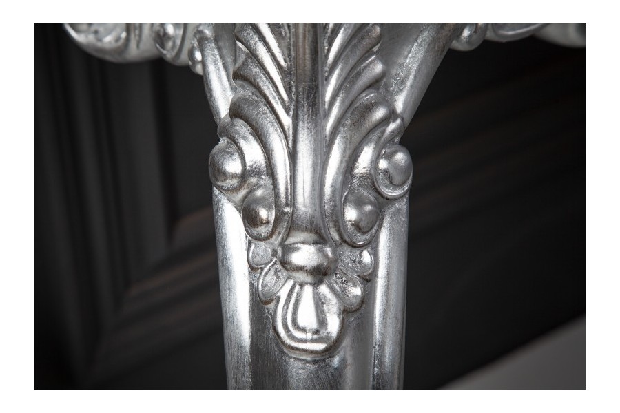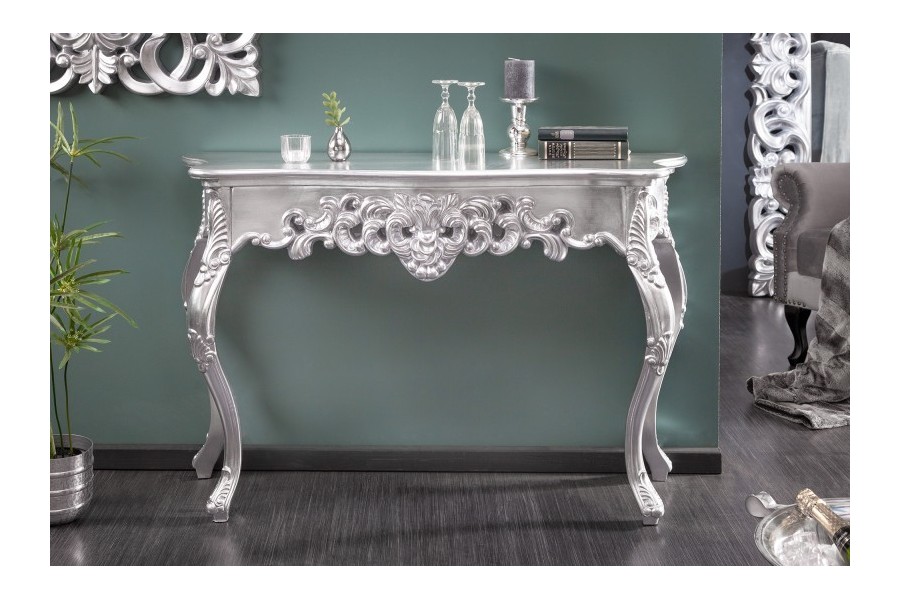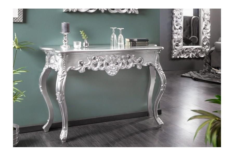 Fabuleuse console classique coloris argenté!Fabriquée en bois et orné par des jolies sculptures avec un design baroque,original et unique car chaque console est faite à la main.Elle est pratique,élégante et multifonctionnelle à la fois avec un coloris chaud et charmant,parfaite à placer dans une entrée ou tout autre pièce raffinée!