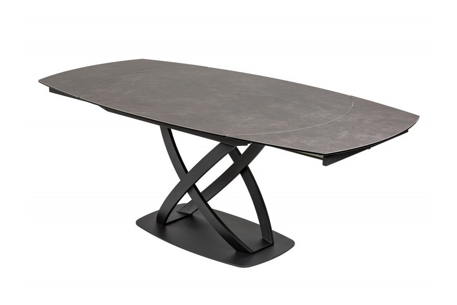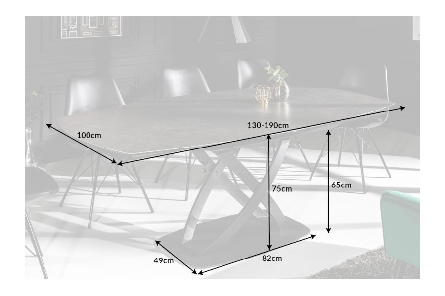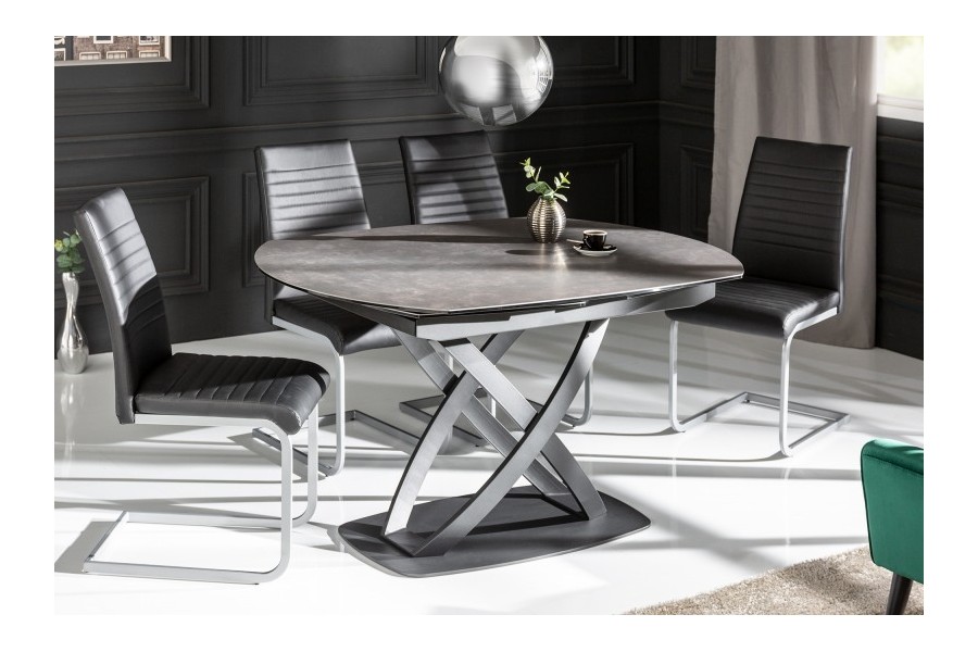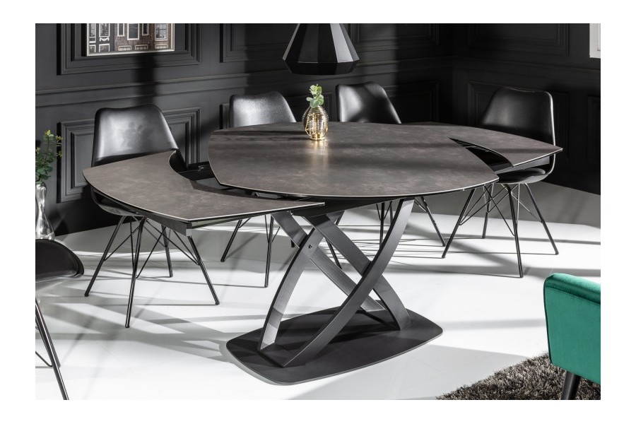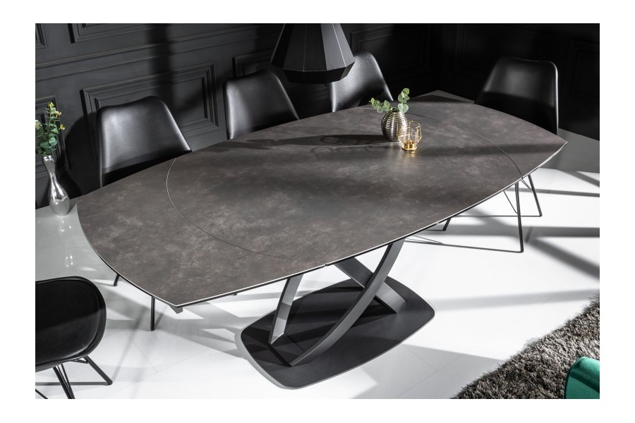 INES est une table unique dotée d'une solide base en métal enduit de poudre qui offre une excellente stabilité. Son plateau est en céramique de haute qualité et en verre de sécurité avec un design en béton de couleur anthracite. Le dessus de table peut être étendu et rétracté à l'aide d'un mécanisme rotatif. Combinez la table à manger moderne selon vos goûts ! Chaque pièce est unique en son genre.