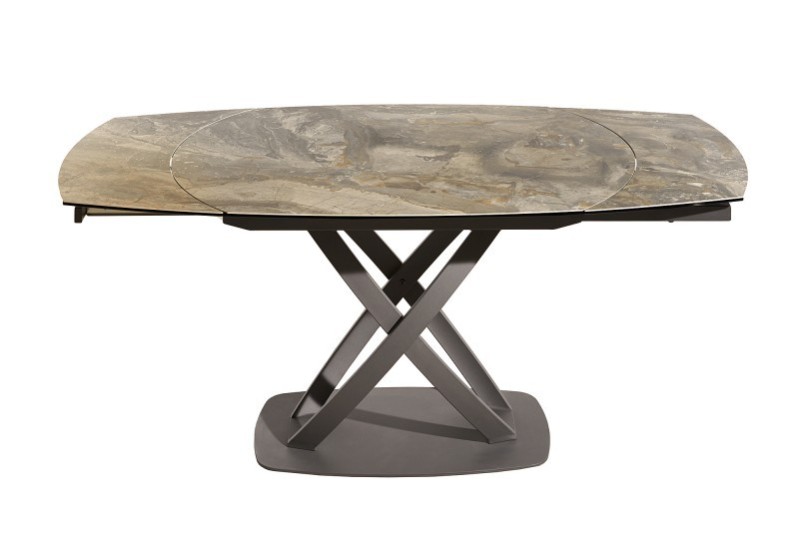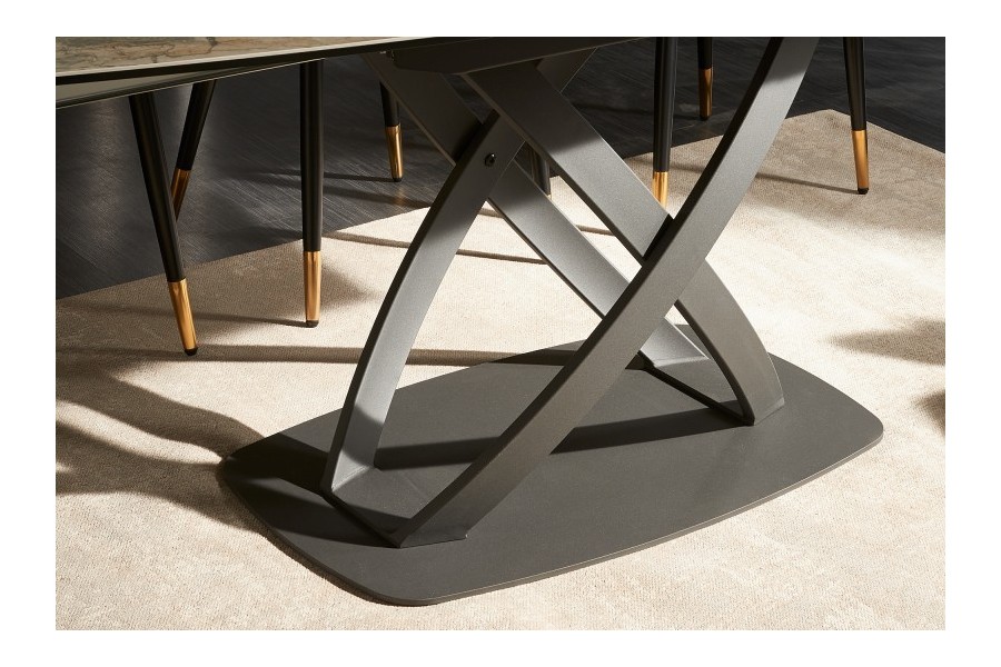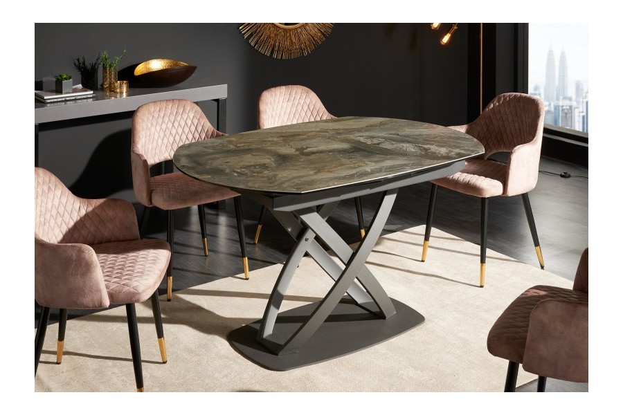 INES est une table unique dotée d'une solide base en métal enduit de poudre qui offre une excellente stabilité. Son plateau est en céramique de haute qualité et en verre de sécurité avec un design en béton de couleur taupe. Le dessus de table peut être étendu et rétracté à l'aide d'un mécanisme rotatif. Combinez la table à manger moderne selon vos goûts ! Chaque pièce est unique en son genre.