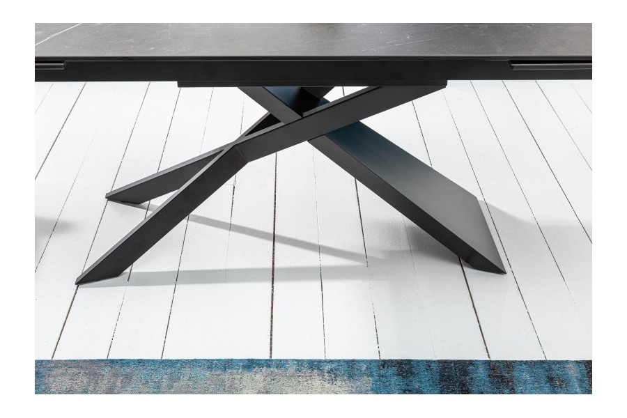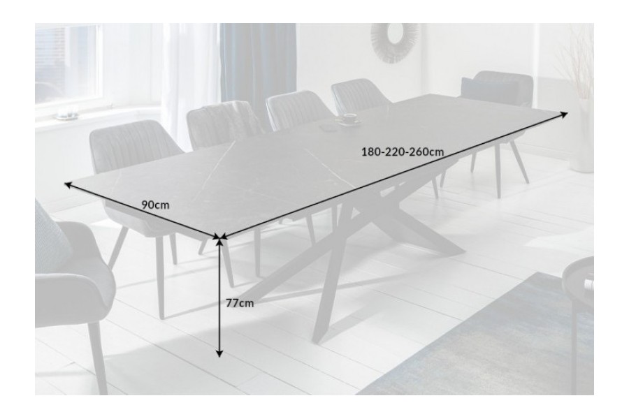 Magnifique table à manger extensible 180-220-260cm avec un design industriel moderne et chic pour 10 personnes ! son plateau de forme rectangulaire est conçu en verre de sécurité et en céramique avec un aspect de pierre graphite, son piétement est en métal avec un design exceptionnel et de très belle couleur noire !