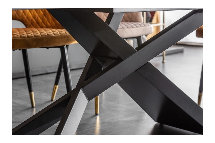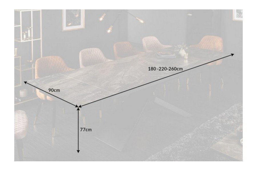 Magnifique table à manger extensible 180-220-260cm avec un design industriel moderne et chic pour 10 personnes ! son plateau de forme rectangulaire est conçu en verre de sécurité et en céramique avec un aspect marbre foncé, son piétement est en métal avec un design exceptionnel et de très belle couleur noire !