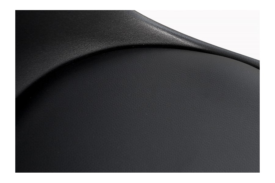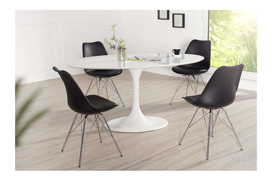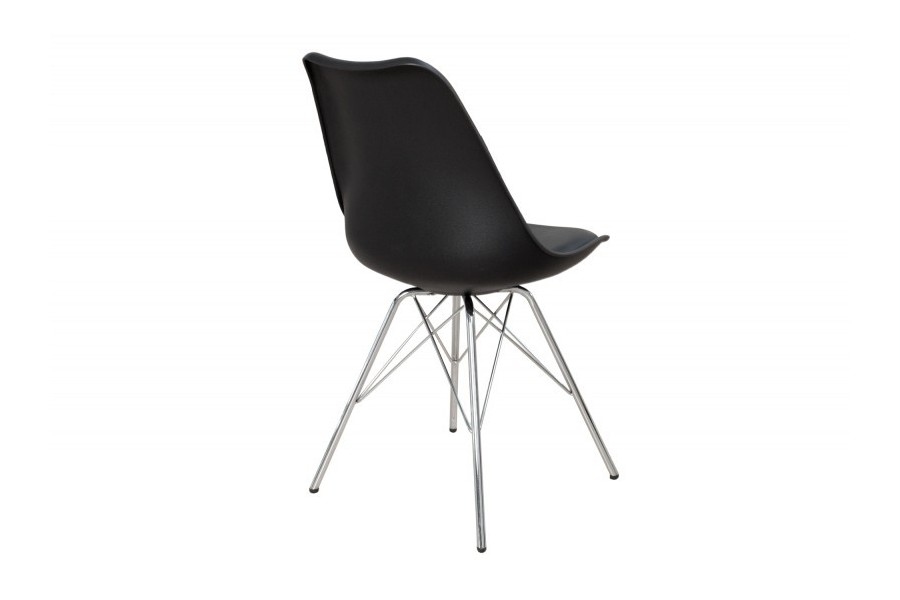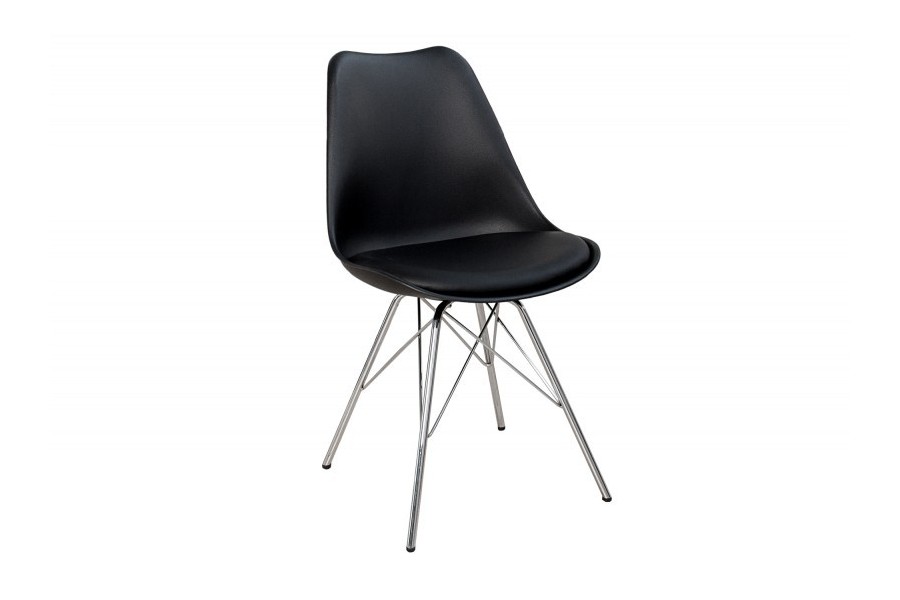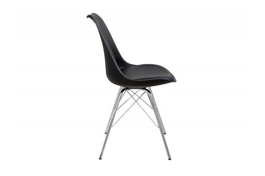 Chaise élégante composée d'une assise noire rembourrée en simili cuir, un dossier en plastique, et un piétement en métal chromé amènera un design luxueux à votre intérieur.