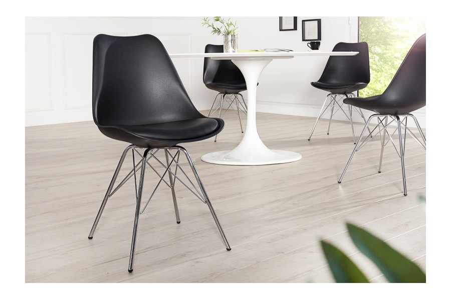 Magnifique chaise moderne ornera la décoration de votre intérieur, avec une assise noire en simili cuir, un dossier en plastique et un piétement en métal chromé.