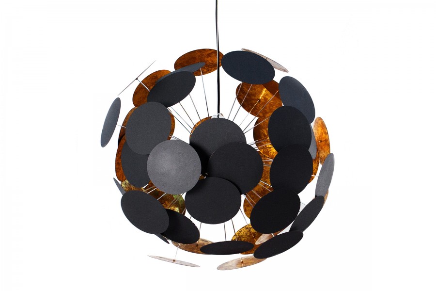 Splendide lampe suspendue moderne coloris doré et noir ! Sa conception est conçue en métal de haute qualité et composée de 50 disques d’une forme sphérique miroitant dans les cercles ampoule. Sa conception est très élégante avec un design simple et innovant et des coloris sobres et élégants ! Elle est parfaite à votre intérieur !