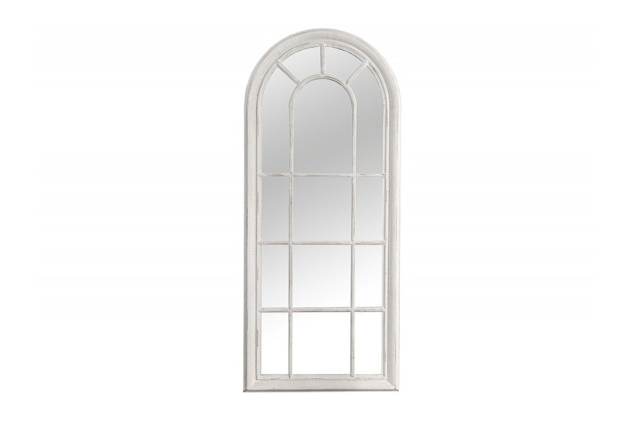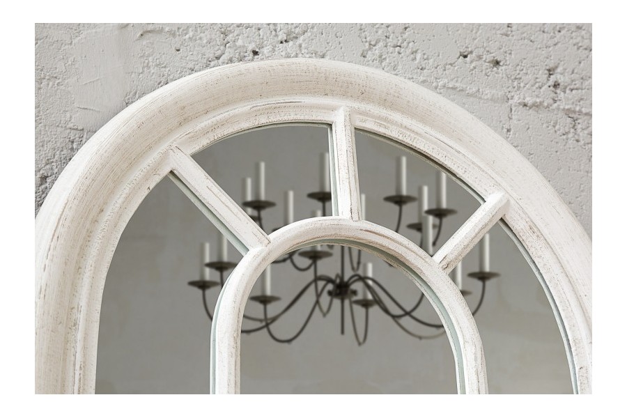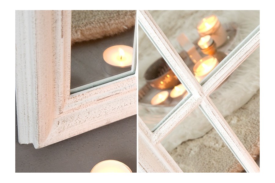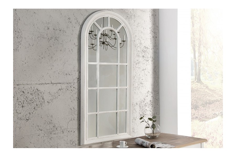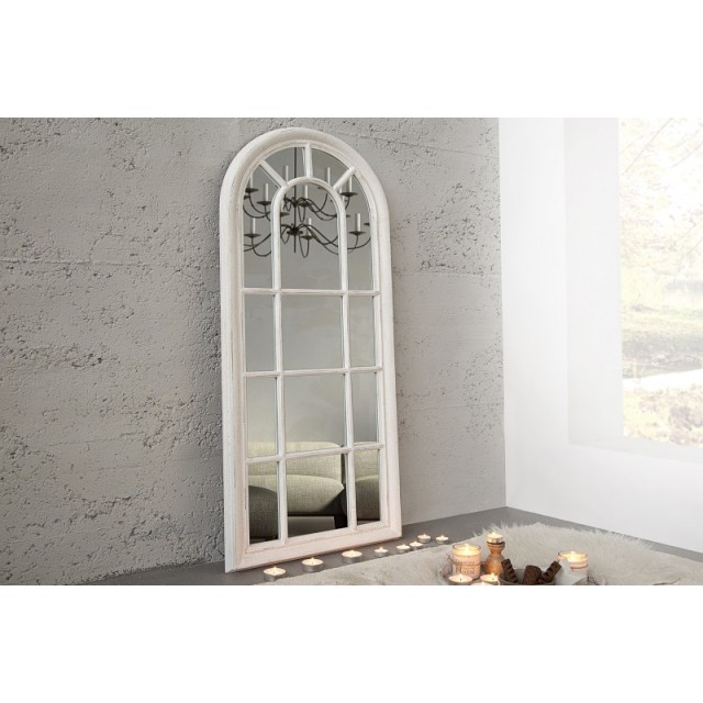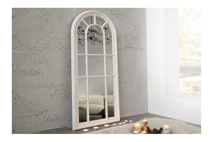 Miroir fenêtre en verre et encadré en bois de couleur blanche, à poser au sol de votre chambre à coucher pour ajouter un effet visuel fascinant et authentique.