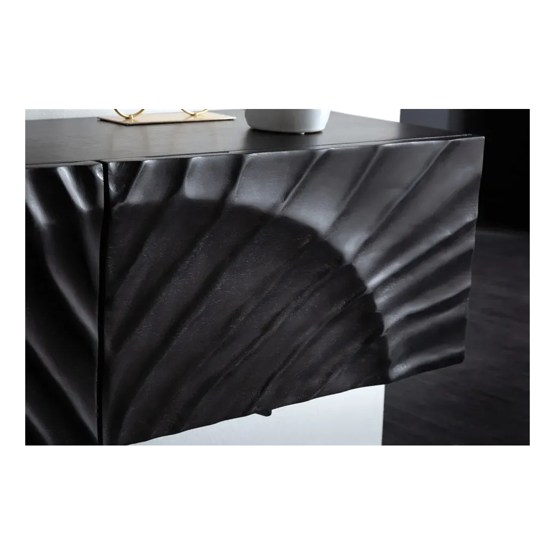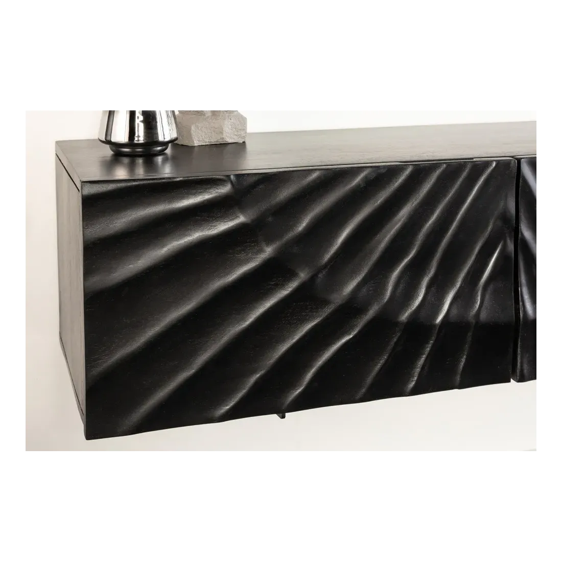 Fabriqué en bois de manguier massif laqué, il se distingue par sa surface en relief 3D sculptée à la main, faisant de chaque pièce un meuble unique. La finition noire met en valeur le travail artisanal tout en conférant au meuble un style chic et contemporain.