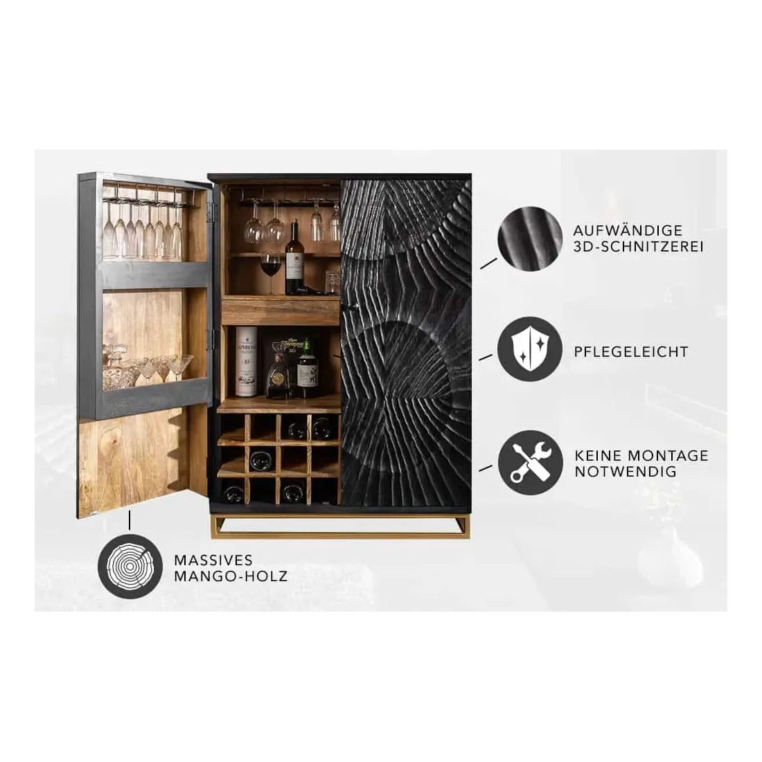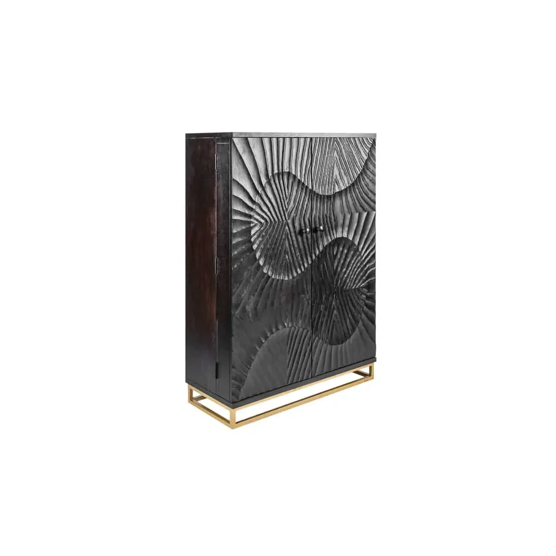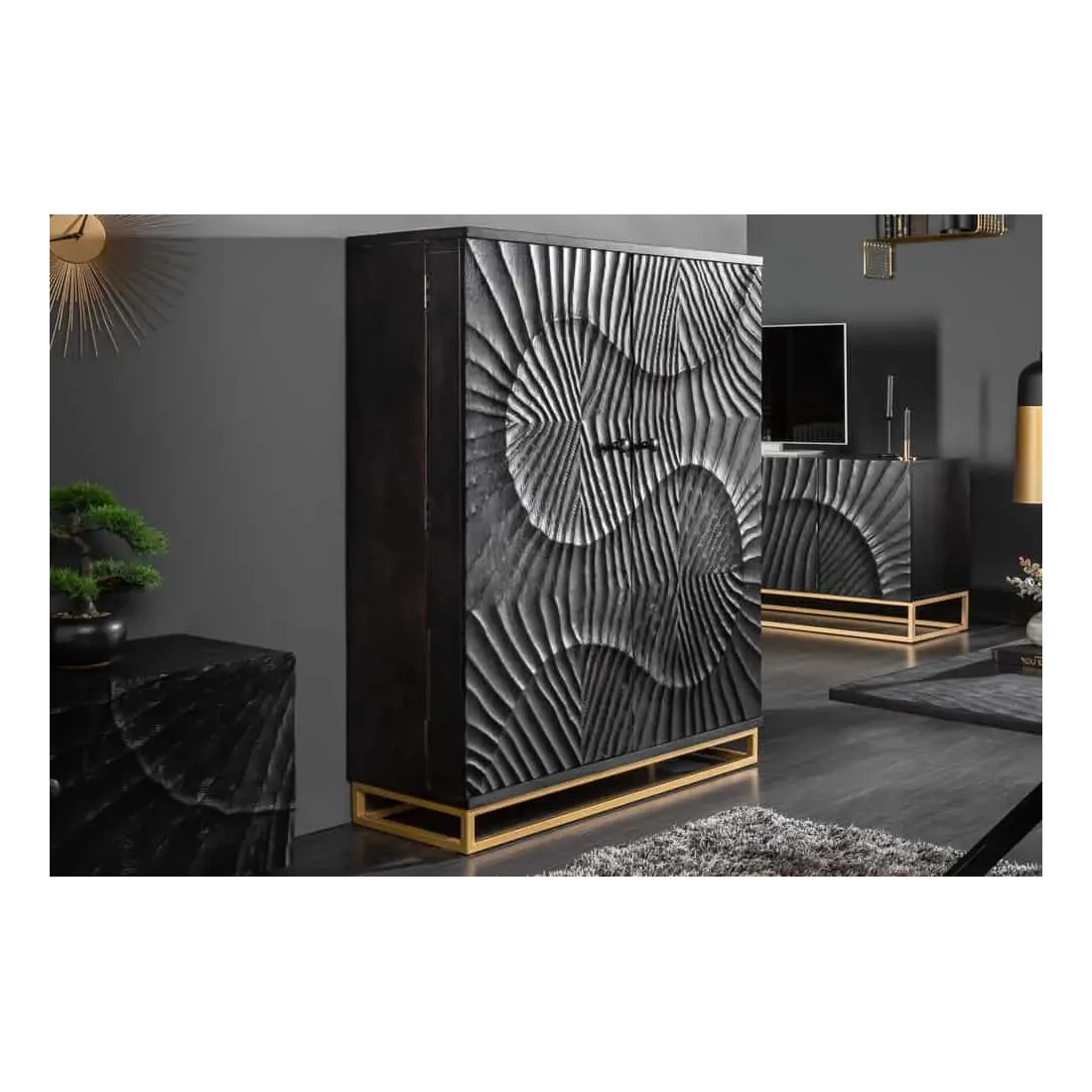 Alliez style et praticité avec le meuble bar SCORPION en bois massif de manguier noir. Ce meuble bar au design unique séduit par sa surface en relief 3D sculptée artisanalement, dont le motif organique s’étend sur l’ensemble des portes. Chaque pièce est ainsi unique.