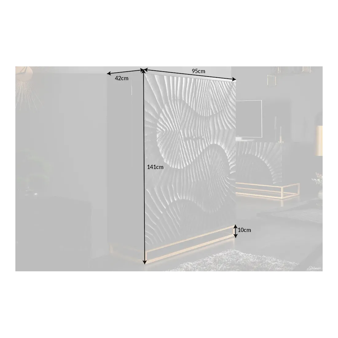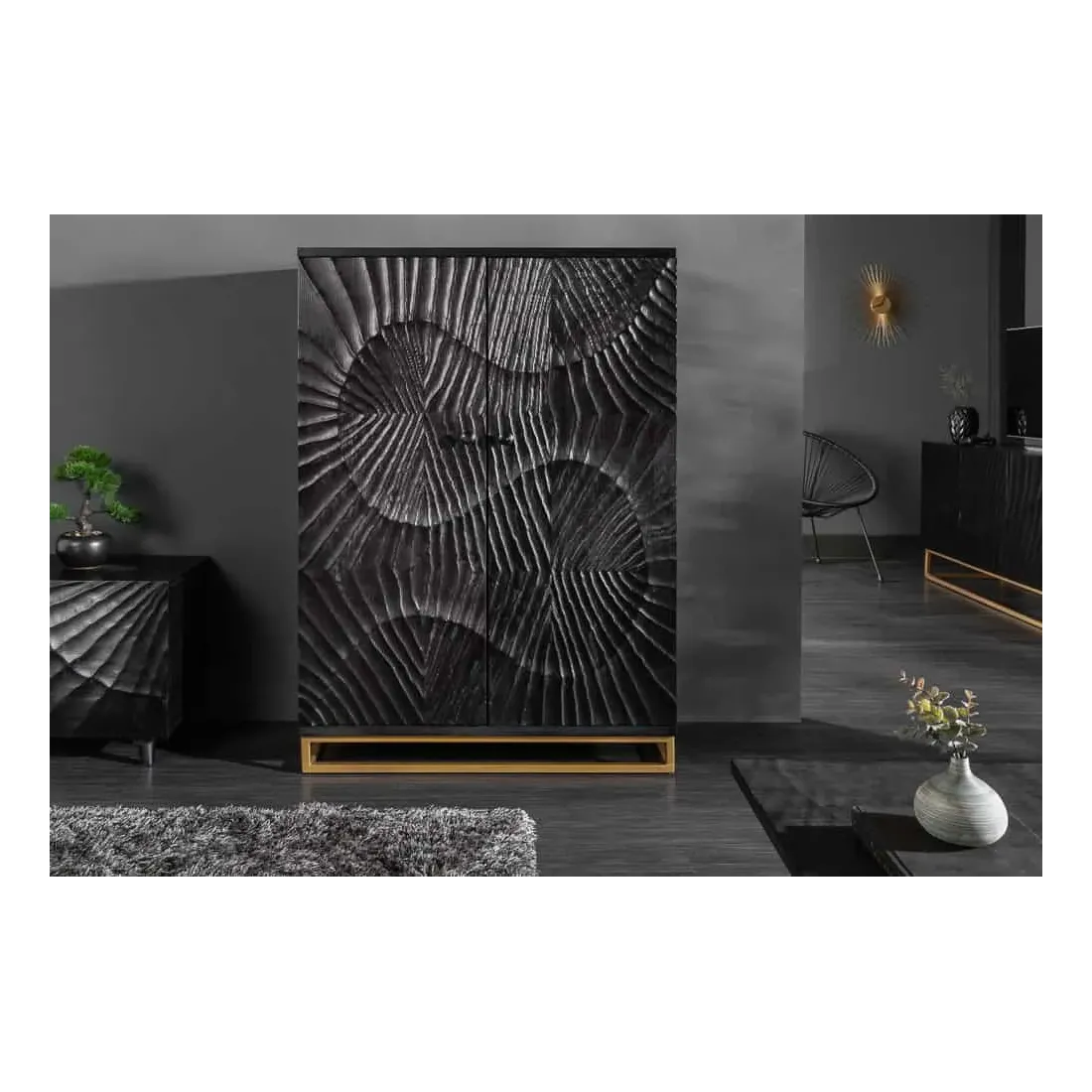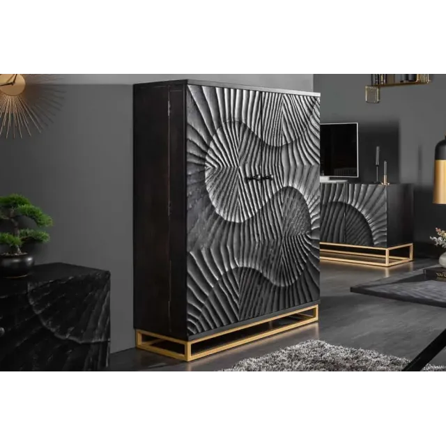 Alliez style et praticité avec le meuble bar SCORPION en bois massif de manguier noir. Ce meuble bar au design unique séduit par sa surface en relief 3D sculptée artisanalement, dont le motif organique s’étend sur l’ensemble des portes. Chaque pièce est ainsi unique.