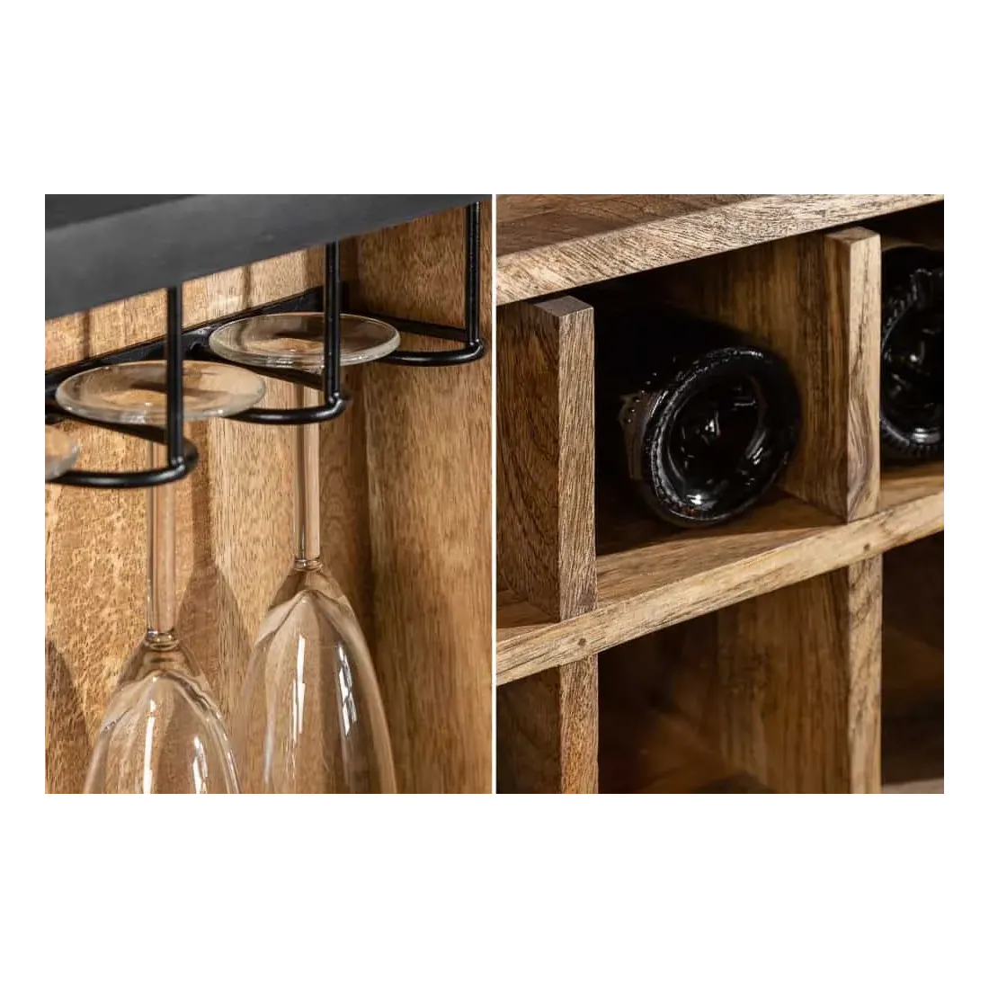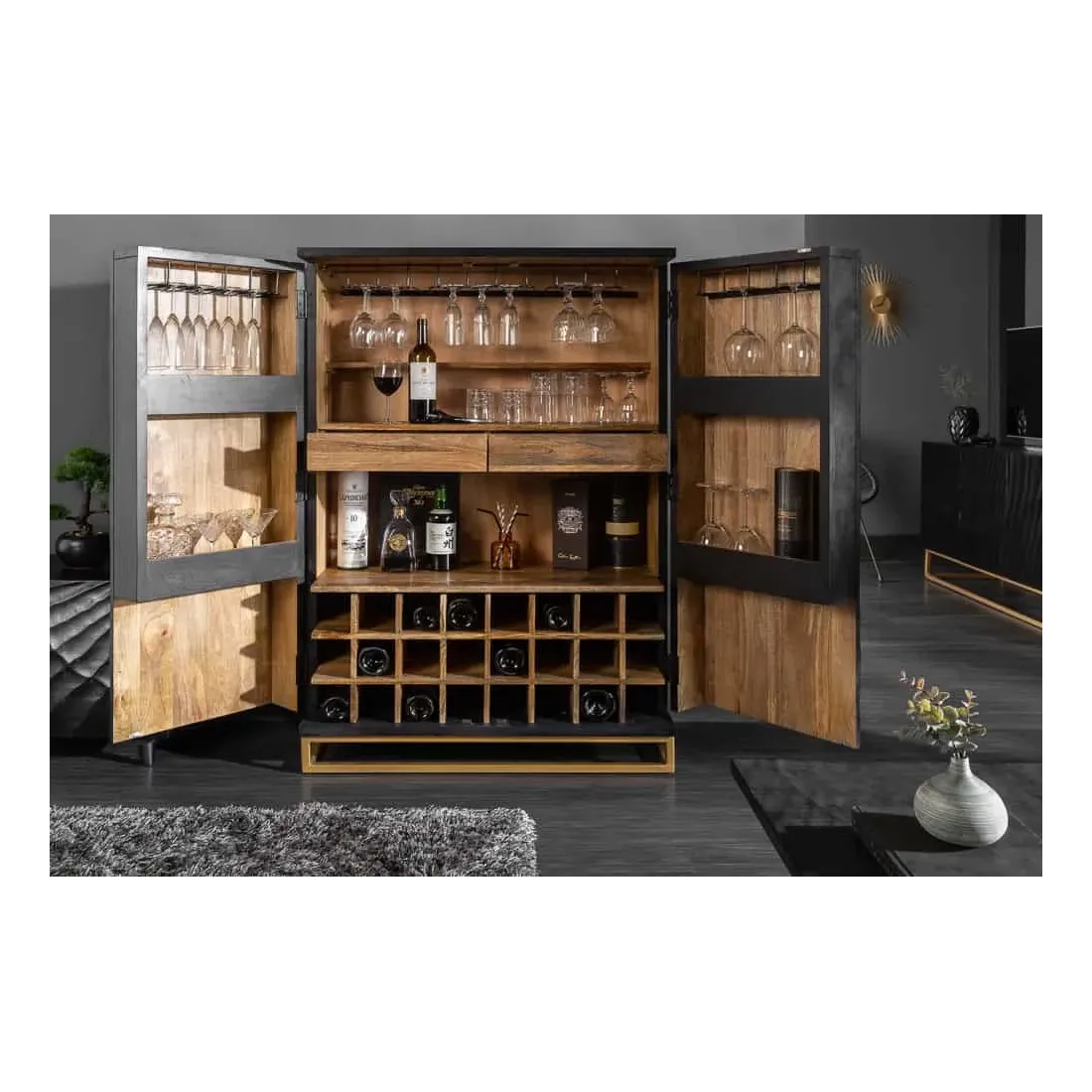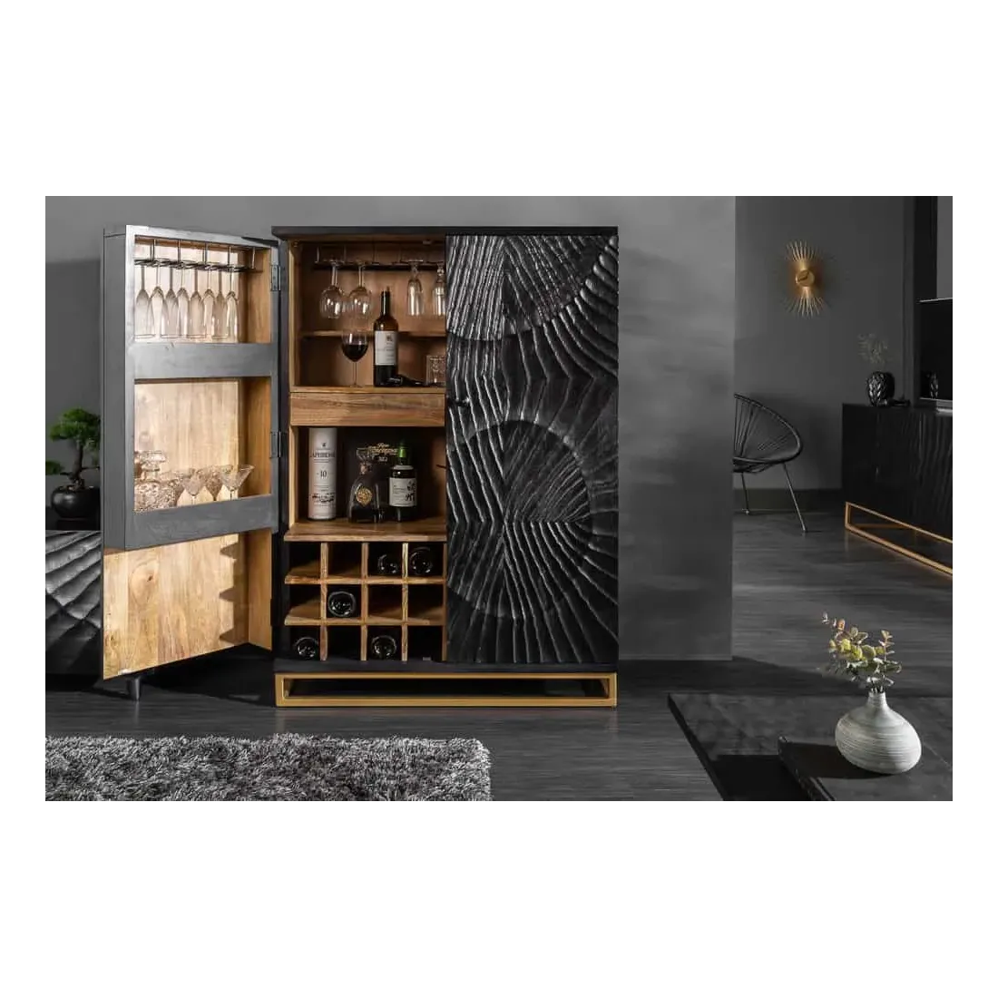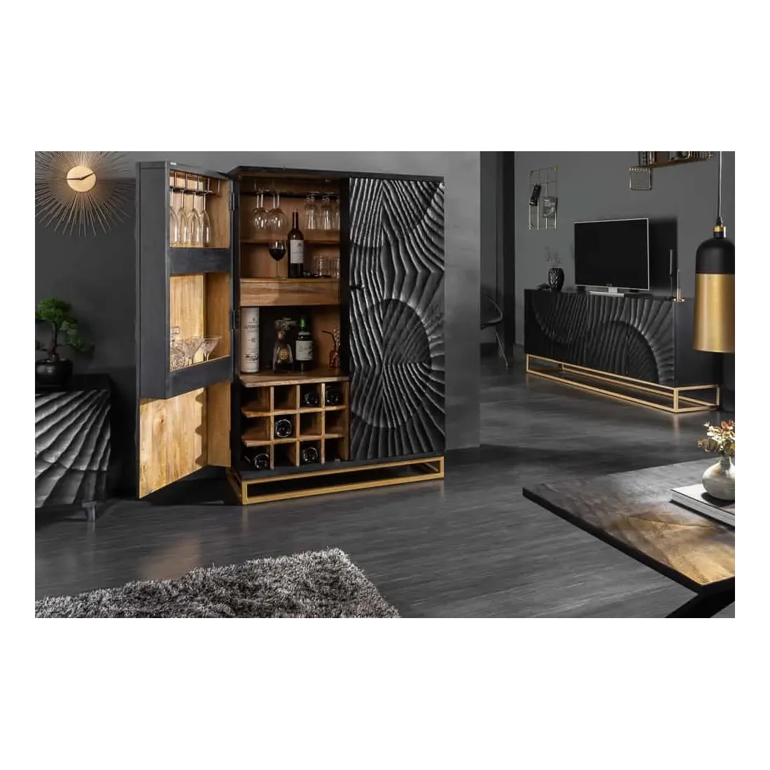 Le Meuble bar SCORPION est une véritable pièce maîtresse en bois massif de manguier noir, rehaussée d’un piètement doré en métal. Sa façade 3D sculptée à la main attire tous les regards. À l’intérieur, vous profitez d’un aménagement généreux : 24 emplacements pour bouteilles, étagères spacieuses et supports pour verres.
