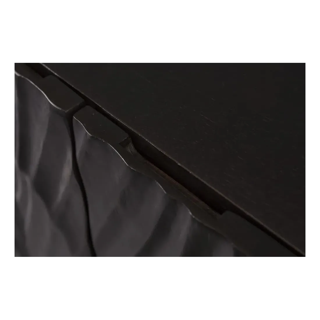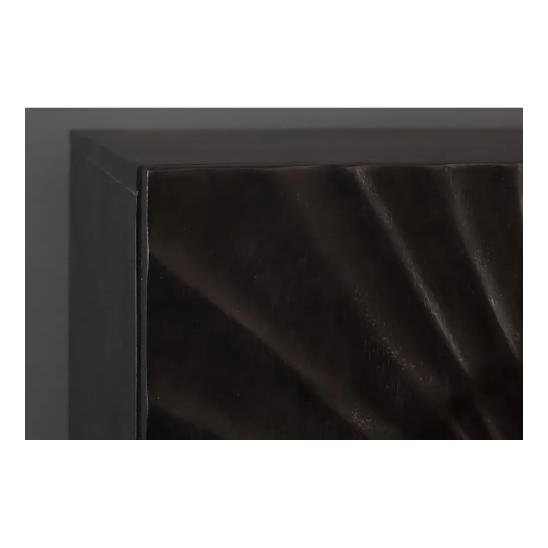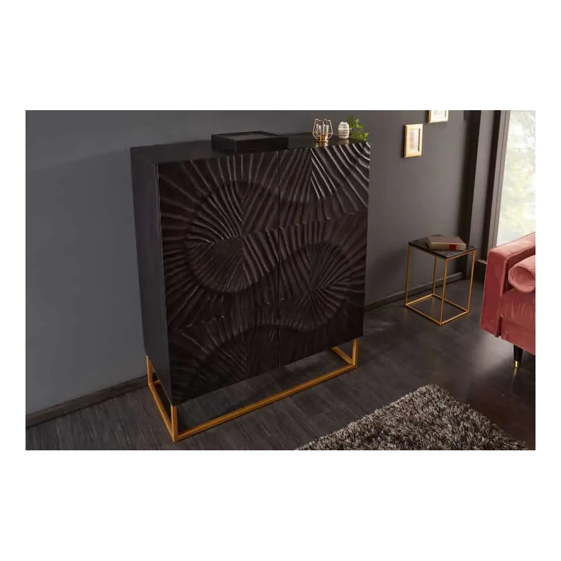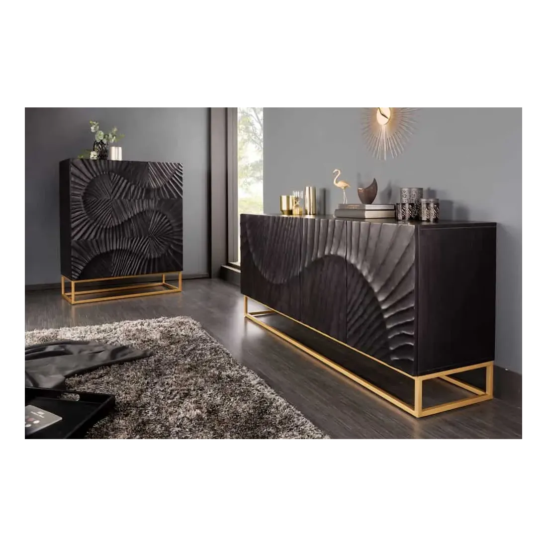 Ce buffet haut en bois massif de manguier séduit par son design moderne, audacieux et prestigieux. Sa finition noire laquée met en valeur le grain précieux du bois et ses motifs sculptés à la main, créant un contraste saisissant avec son piètement doré.