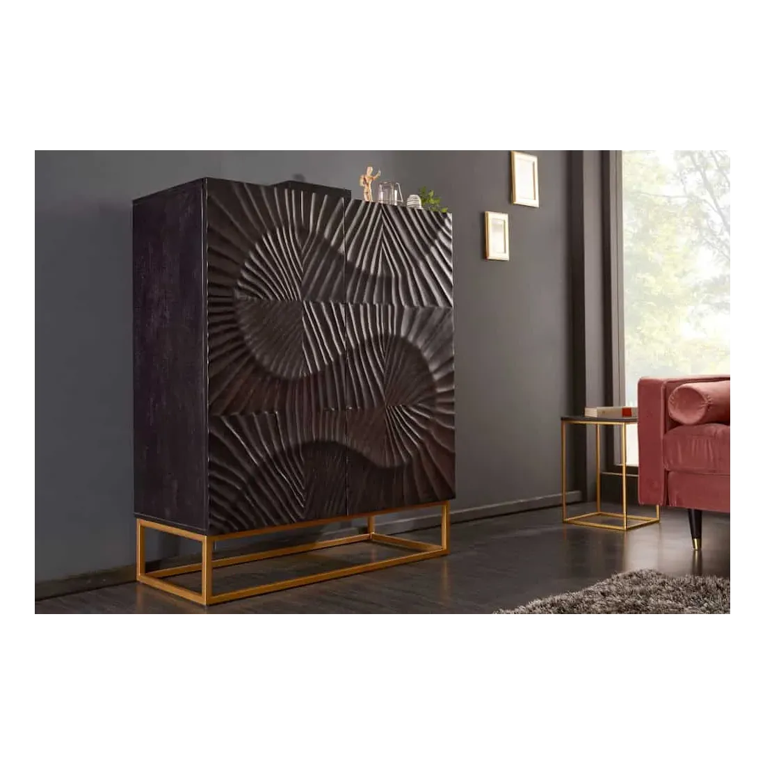 Pour créer un espace harmonieux autour de ce buffet haut en bois noir et or :