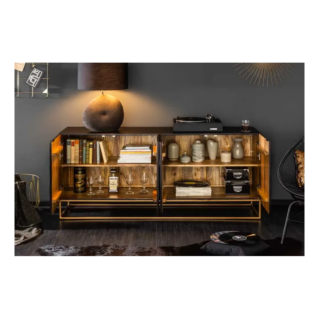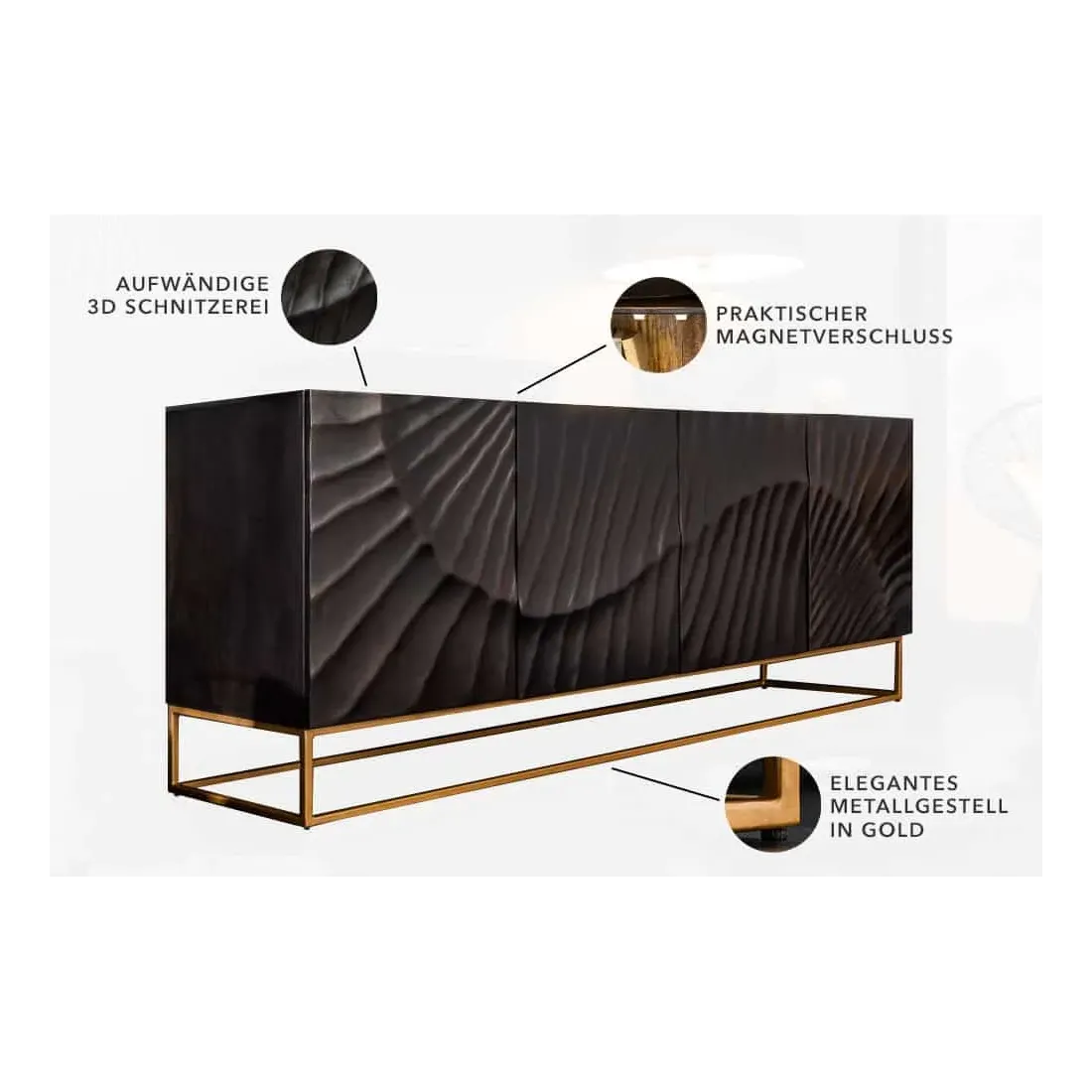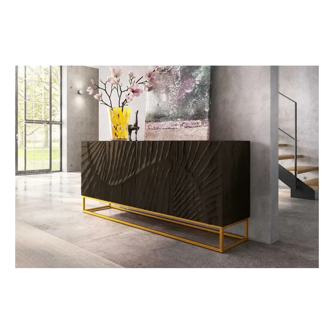 Buffet SCORPION 177 cm – Bois massif de manguier noir sculpté à la main, piètement doré