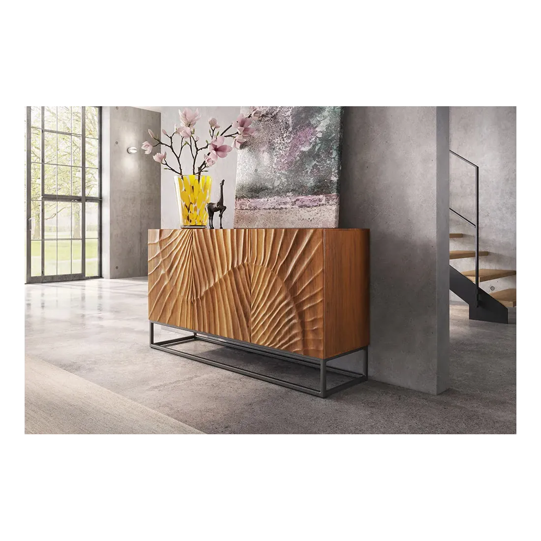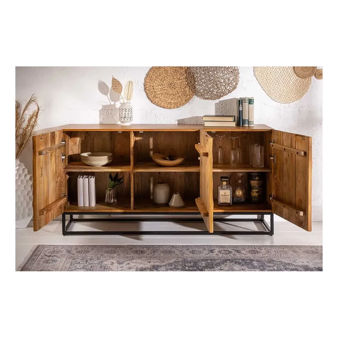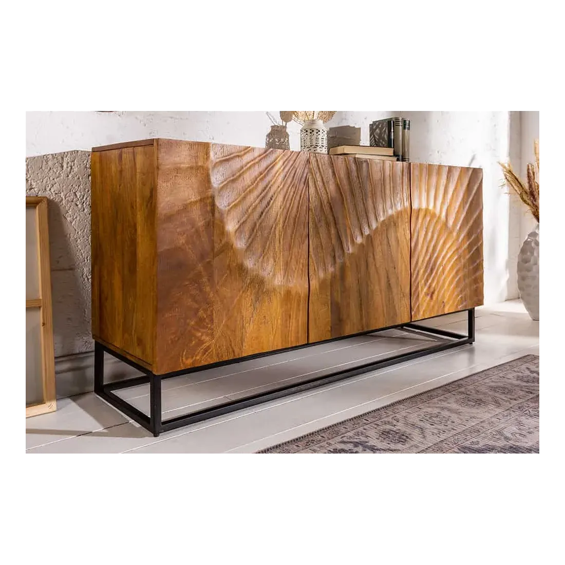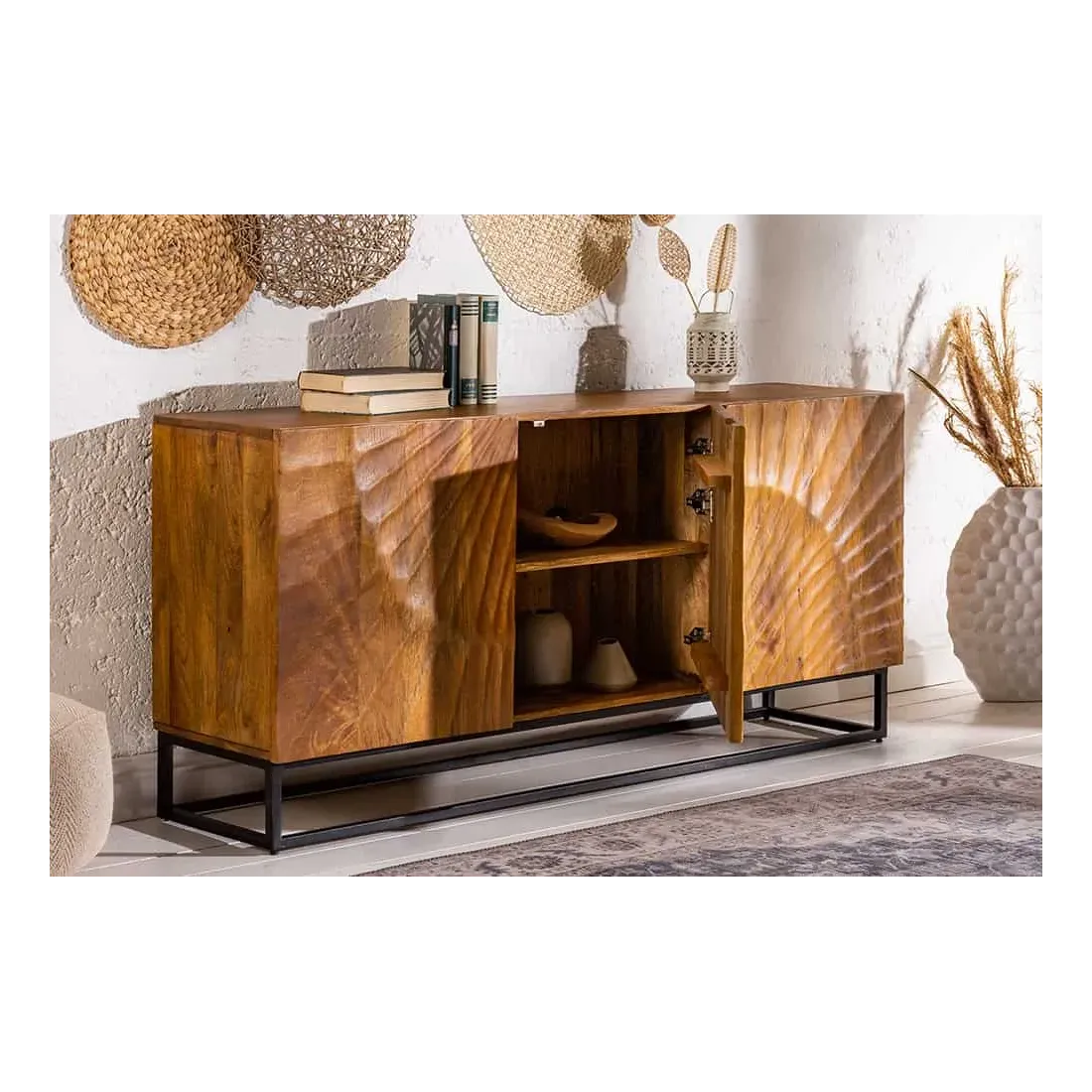 Le buffet SCORPION 140 cm allie artisanat, robustesse et esthétique moderne : ses six grands compartiments, ses portes à fermeture magnétique et son design sculpté à la main en font un meuble pratique et raffiné.