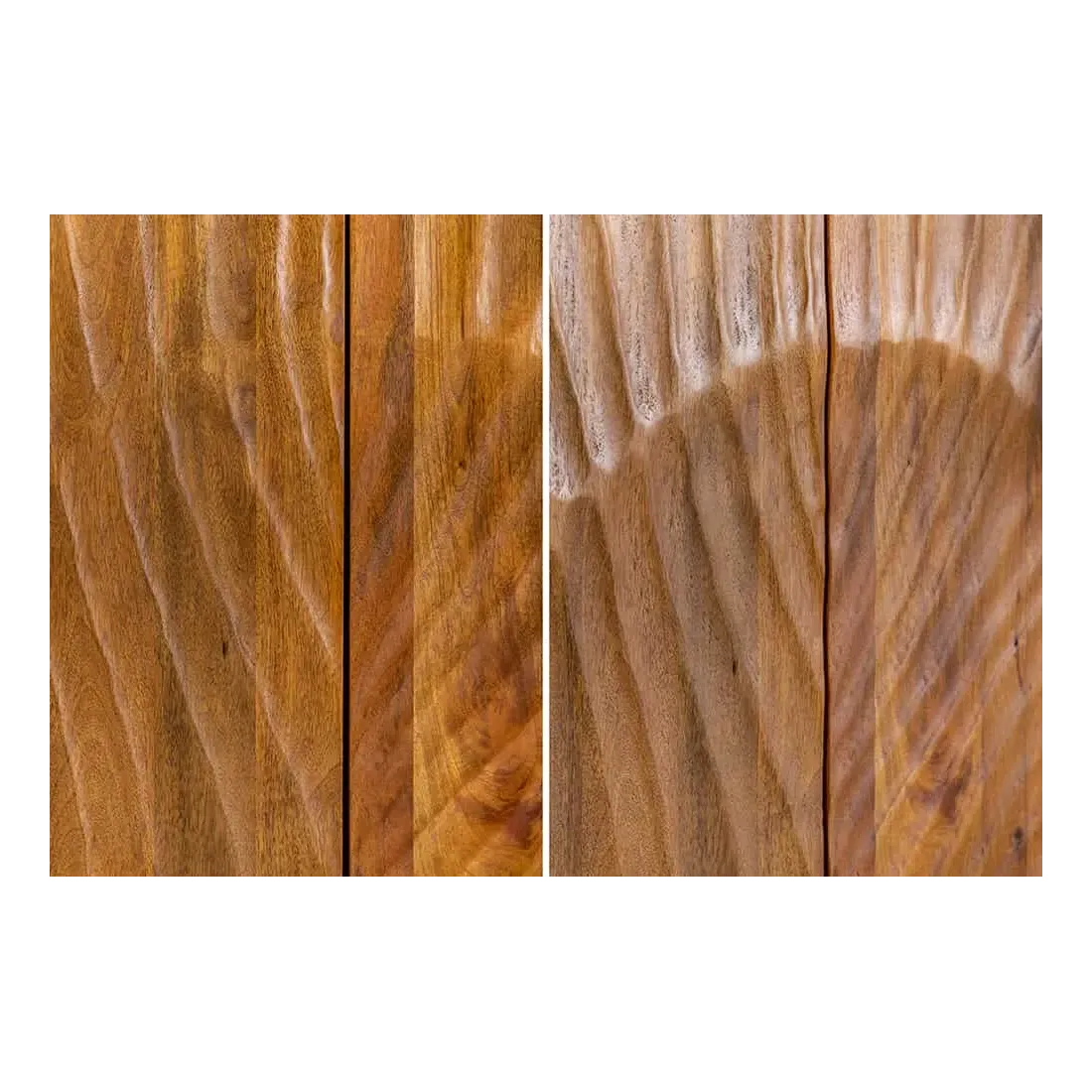 Bois massif de manguier brun laqué avec motif sculpté 3D artisanal, chaque meuble est unique.