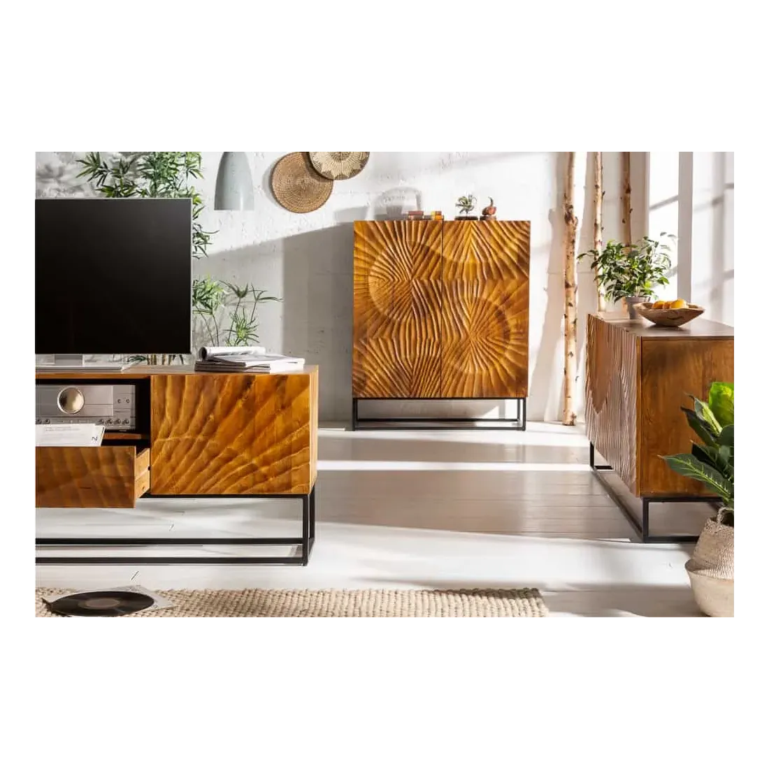 Ce buffet en bois massif de manguier combine robustesse, artisanat et esthétique contemporaine :