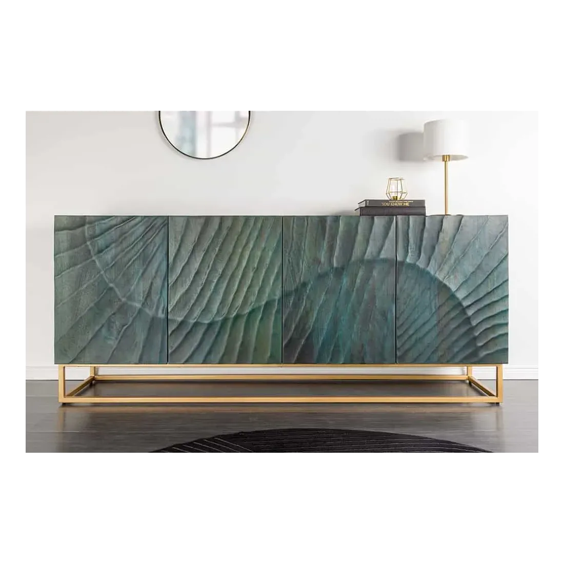 Le Buffet SCORPION 180 cm en manguier massif turquoise avec piètement doré offre un style unique et six espaces de rangement pratiques derrière ses portes sculptées en relief 3D.