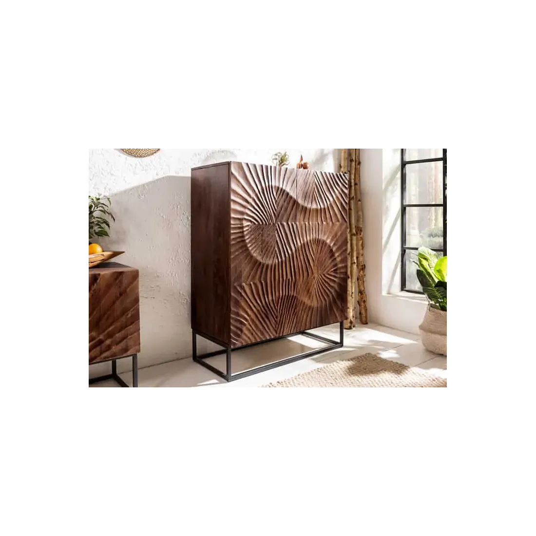 Buffet haut SCORPION 120 cm – Bois massif d’acacia brun foncé, piètement métal noir, façades sculptées 3D