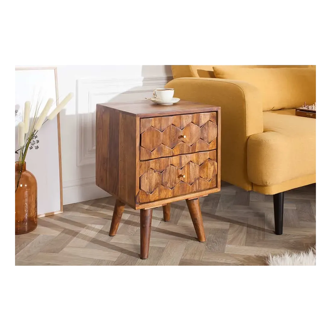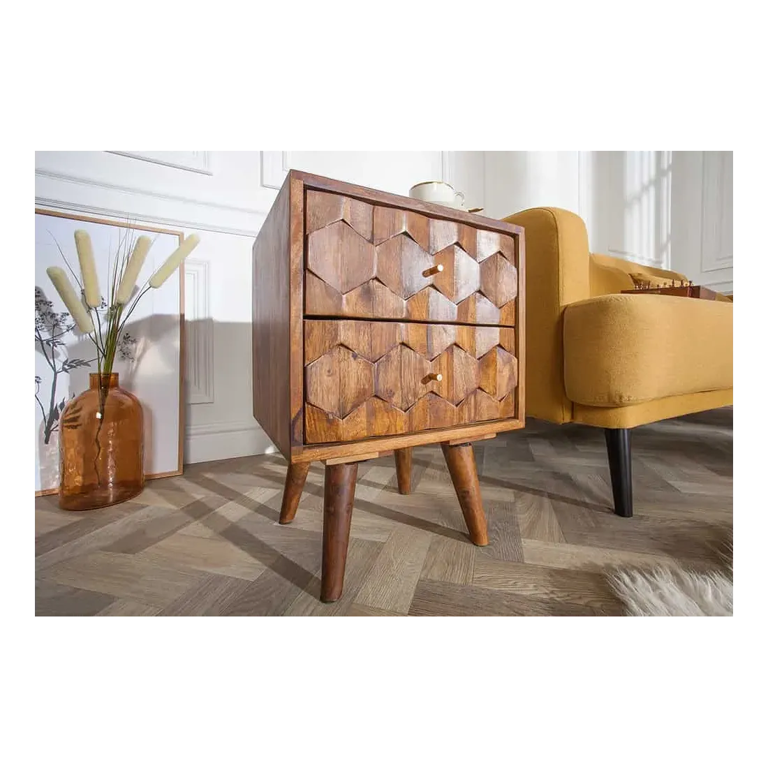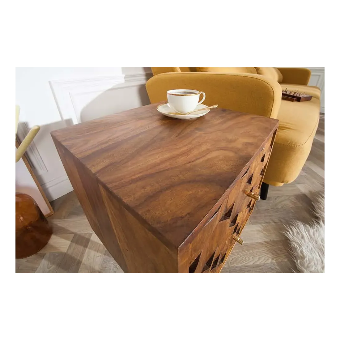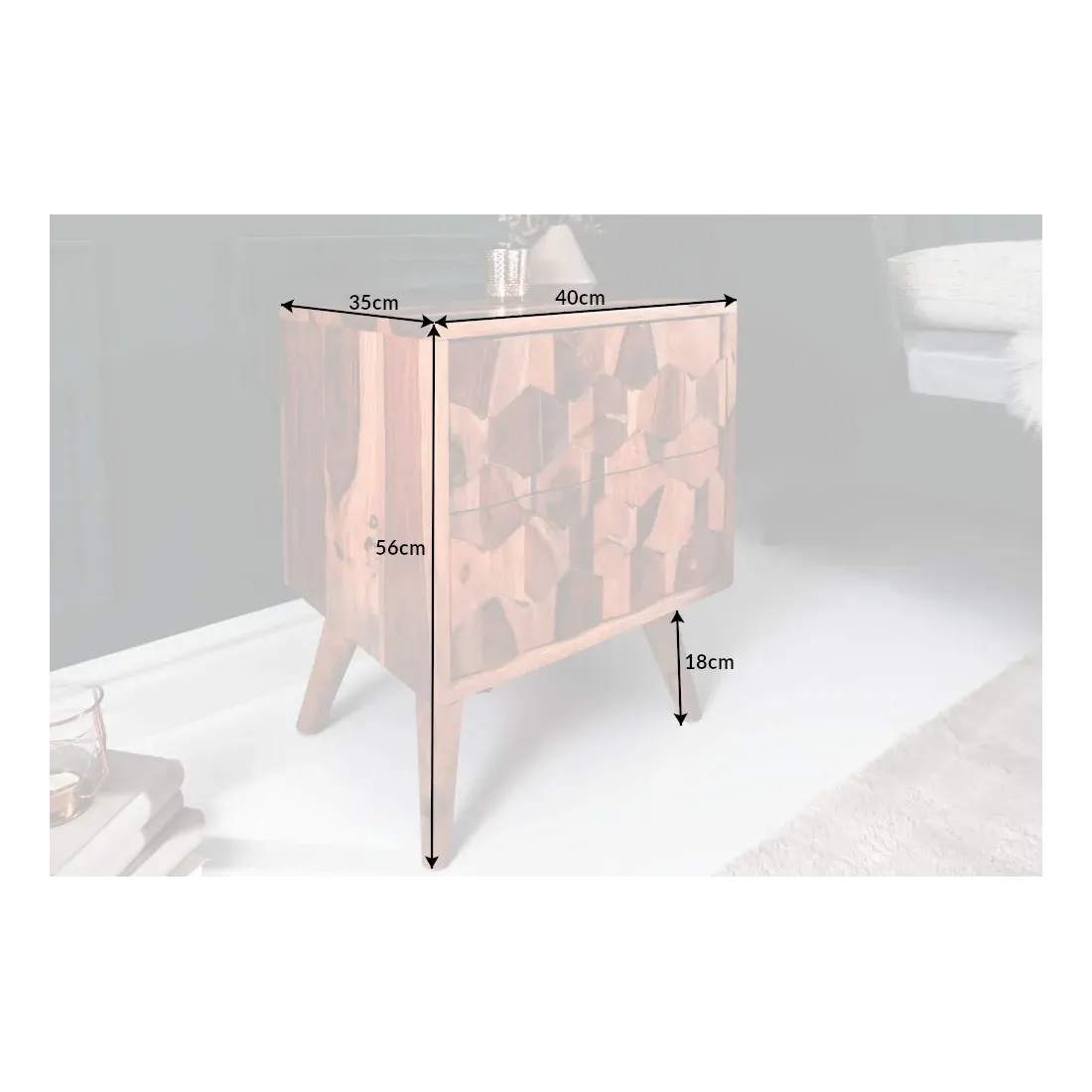 Le Beistelltisch / chevet MYSTIC LIVING séduit par sa surface 3D sculptée à la main et son bois de Sheesham unique, connu pour ses veines et nuances naturelles exceptionnelles. Avec ses deux tiroirs spacieux, il offre un rangement pratique tout en ajoutant une touche élégante à votre intérieur.