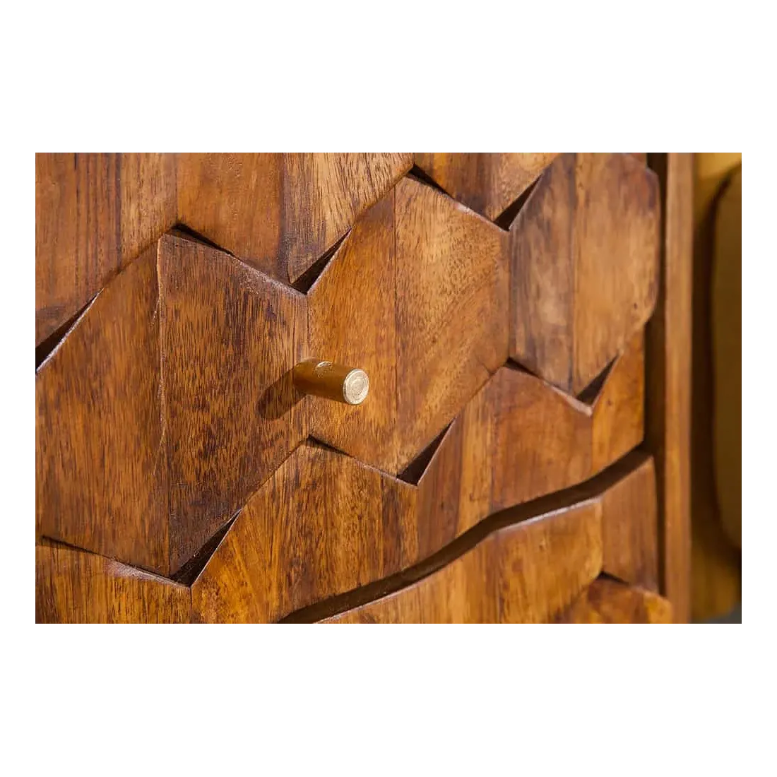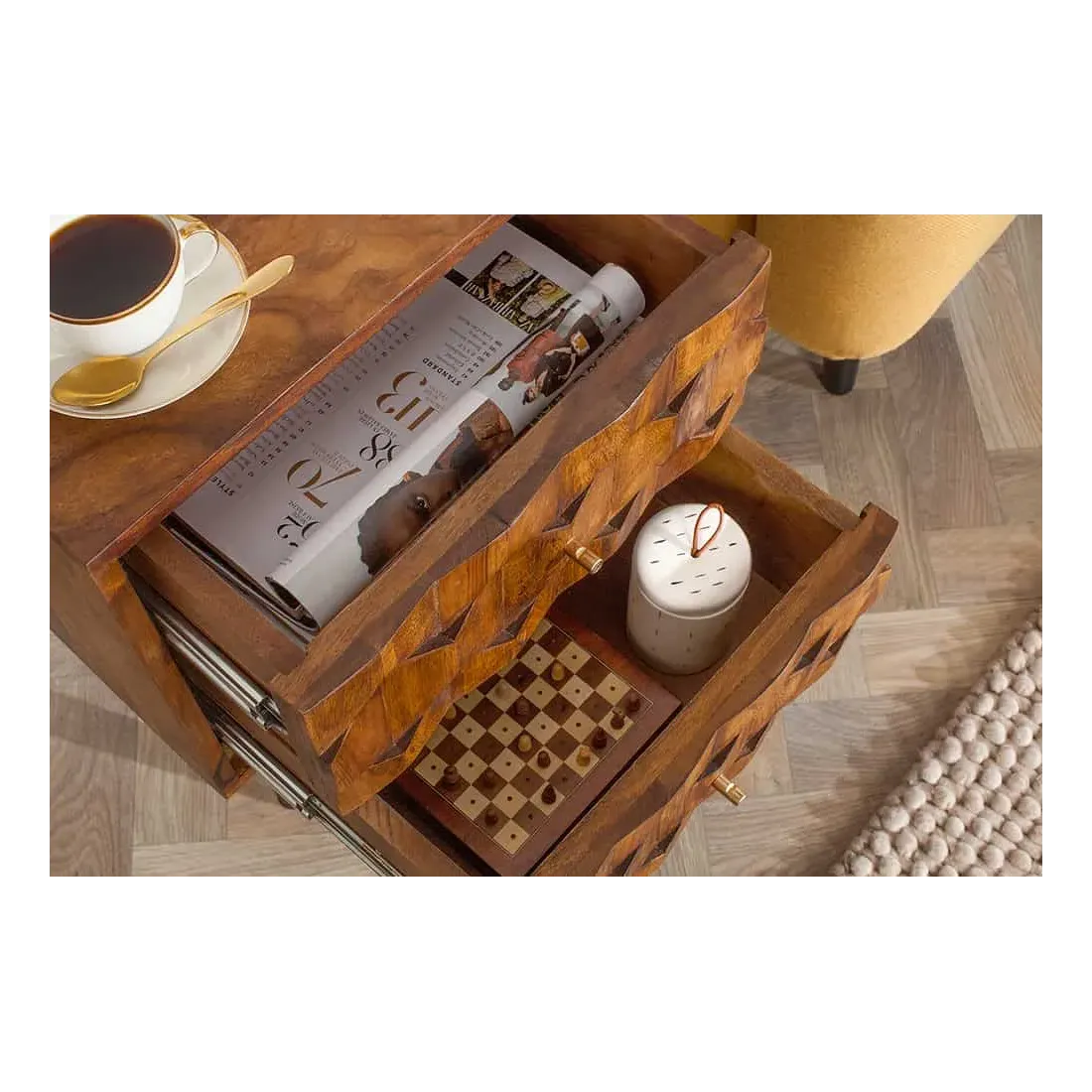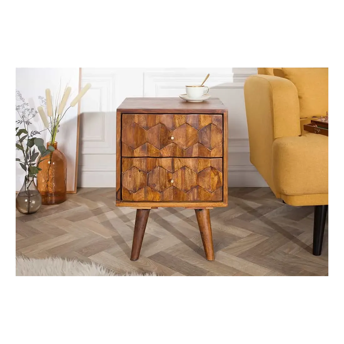 Le Beistelltisch / chevet MYSTIC LIVING séduit par sa surface 3D sculptée à la main et son bois de Sheesham unique, connu pour ses veines et nuances naturelles exceptionnelles. Avec ses deux tiroirs spacieux, il offre un rangement pratique tout en ajoutant une touche élégante à votre intérieur.