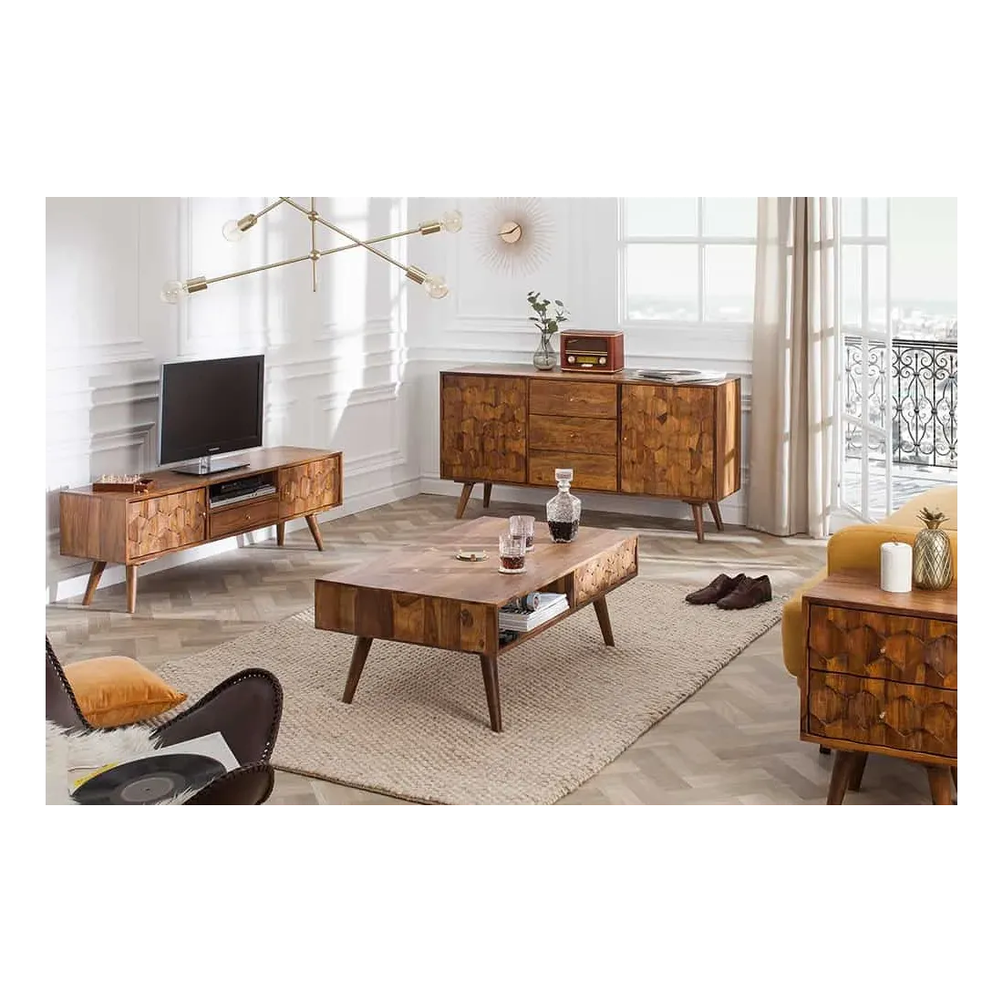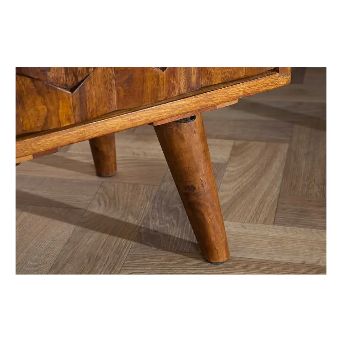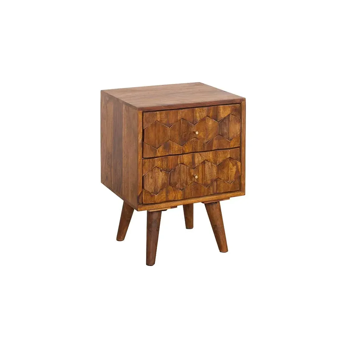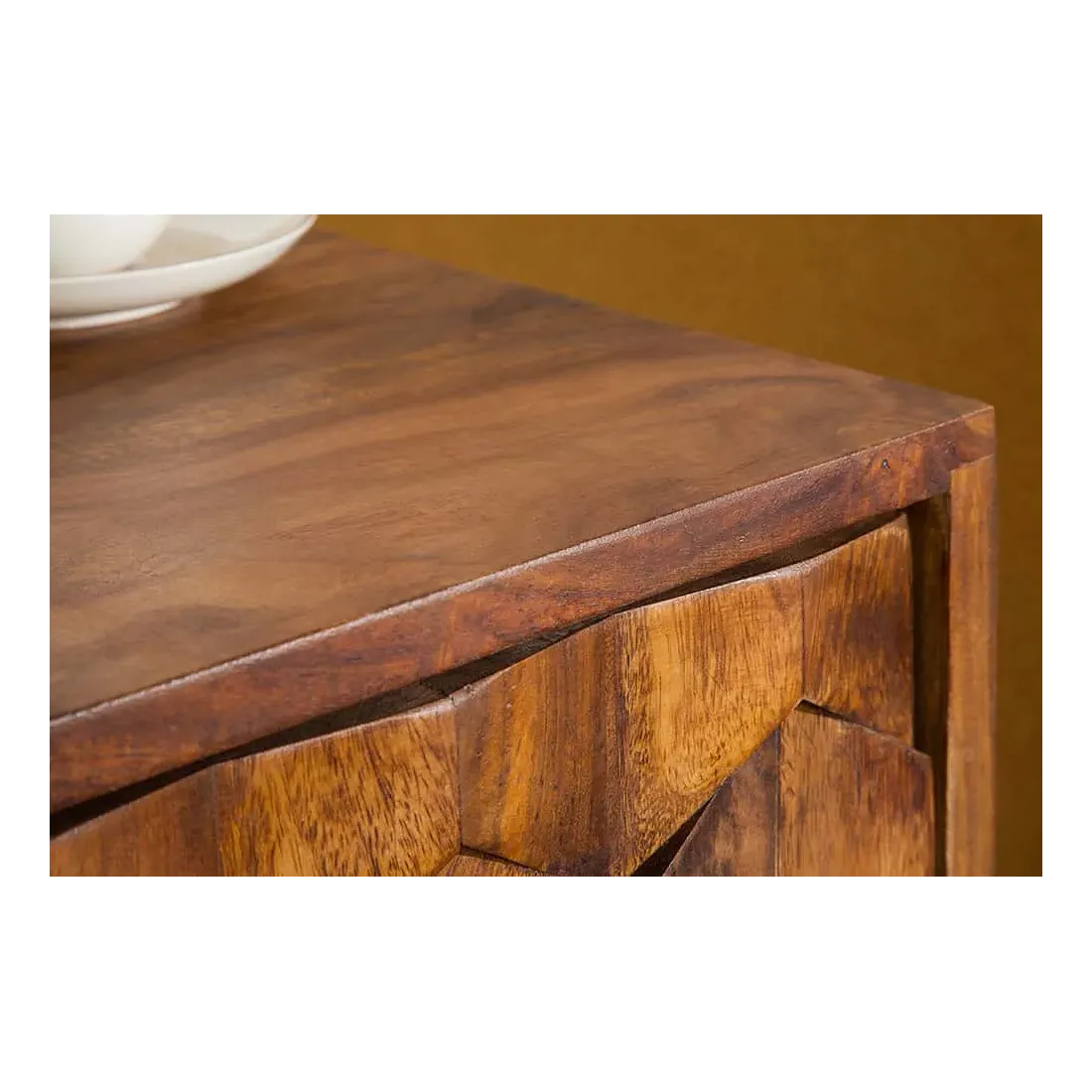 Le Beistelltisch / chevet MYSTIC LIVING séduit par sa surface 3D sculptée à la main et son bois de Sheesham unique, connu pour ses veines et nuances naturelles exceptionnelles. Avec ses deux tiroirs spacieux, il offre un rangement pratique tout en ajoutant une touche élégante à votre intérieur.