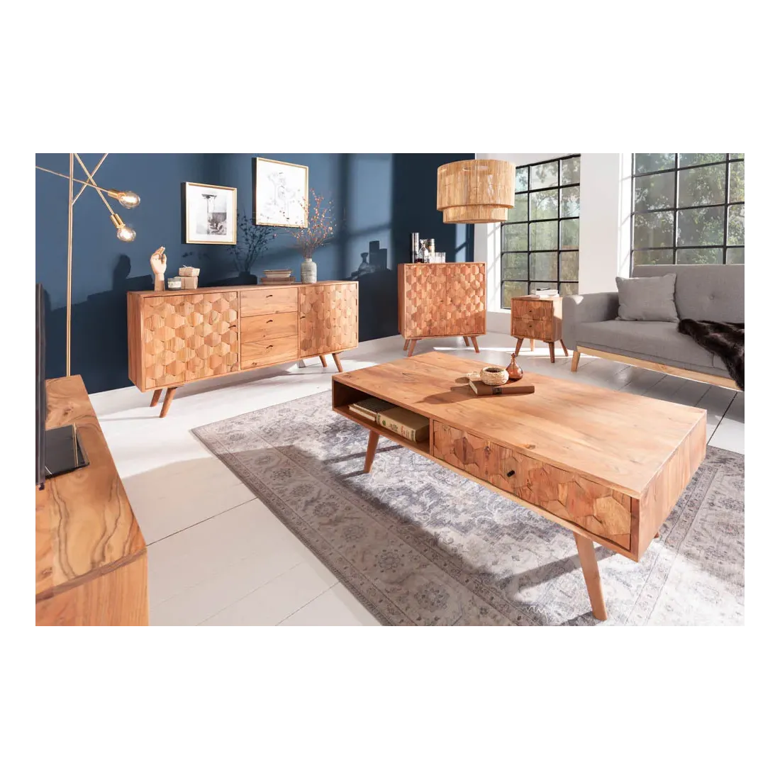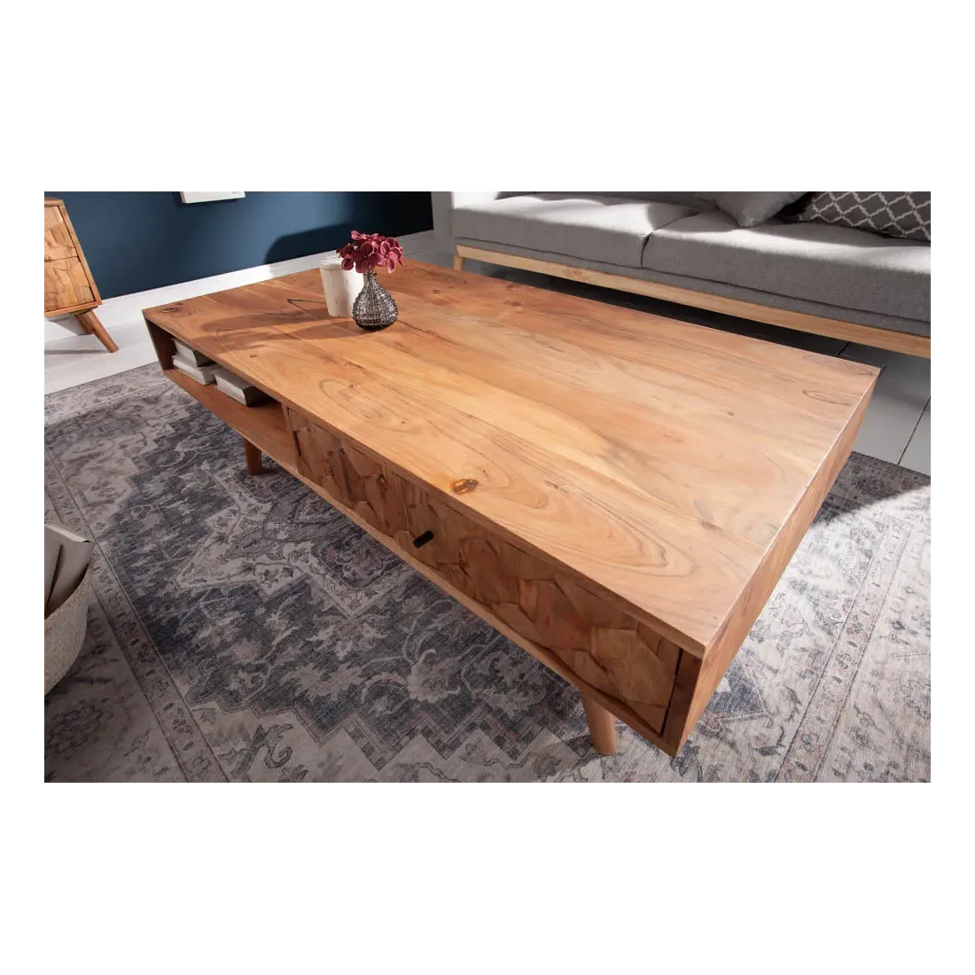 La table basse MYSTIC LIVING allie design naturel et praticité. Son bois d’acacia verni garantit solidité et durabilité, tandis que la surface 3D façonnée à la main met en valeur l’aspect authentique et unique du bois.