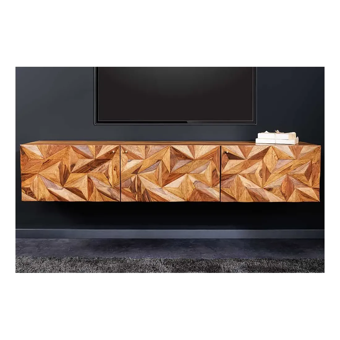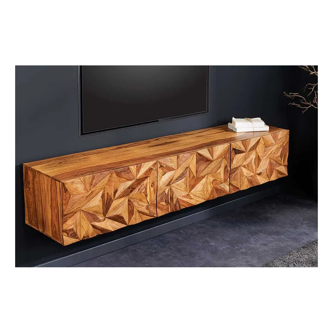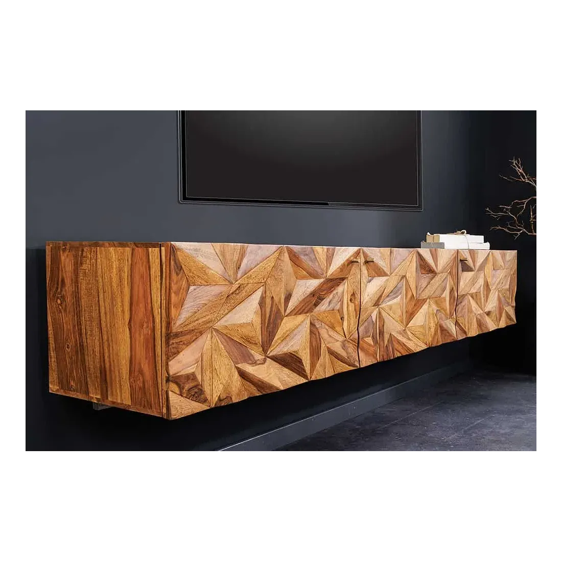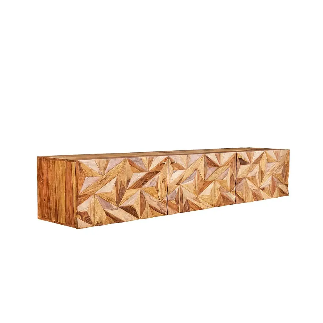 Meuble TV suspendu en bois massif Sheesham 160 cm – Design 3D artisanal & poignées doré mat