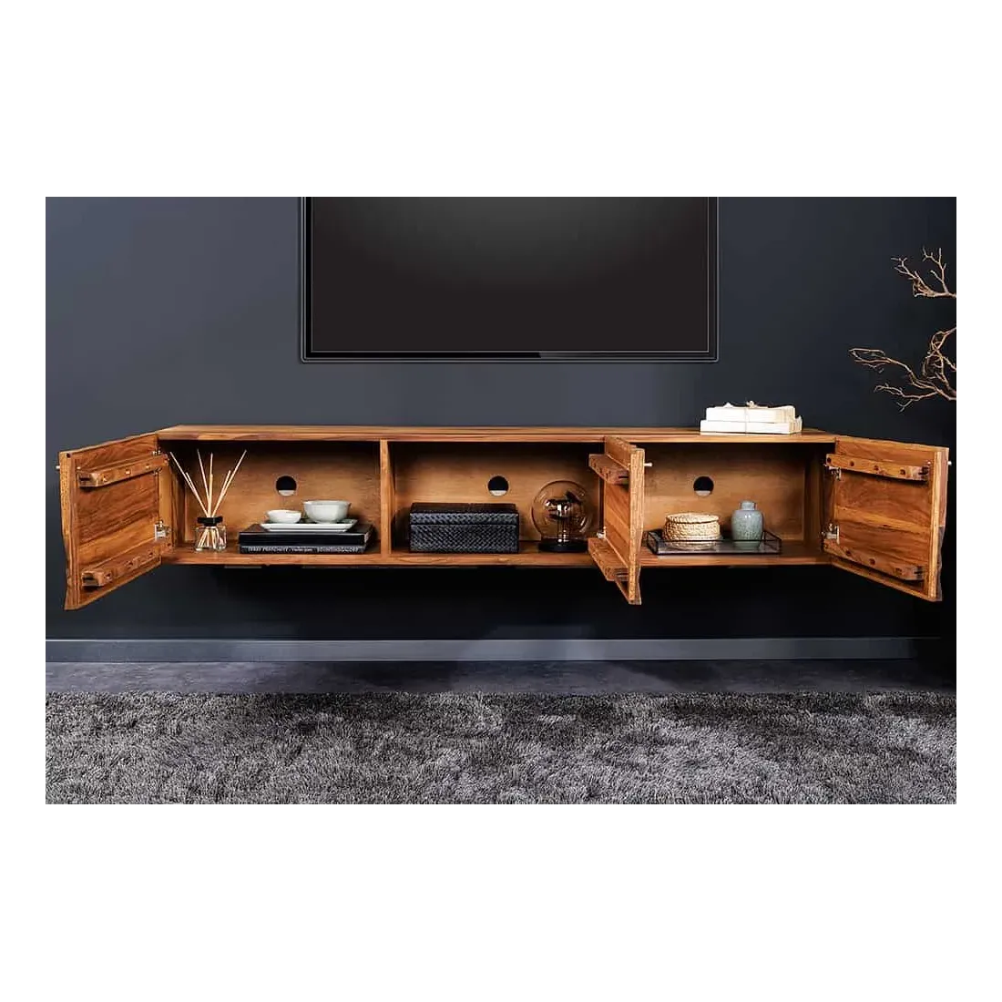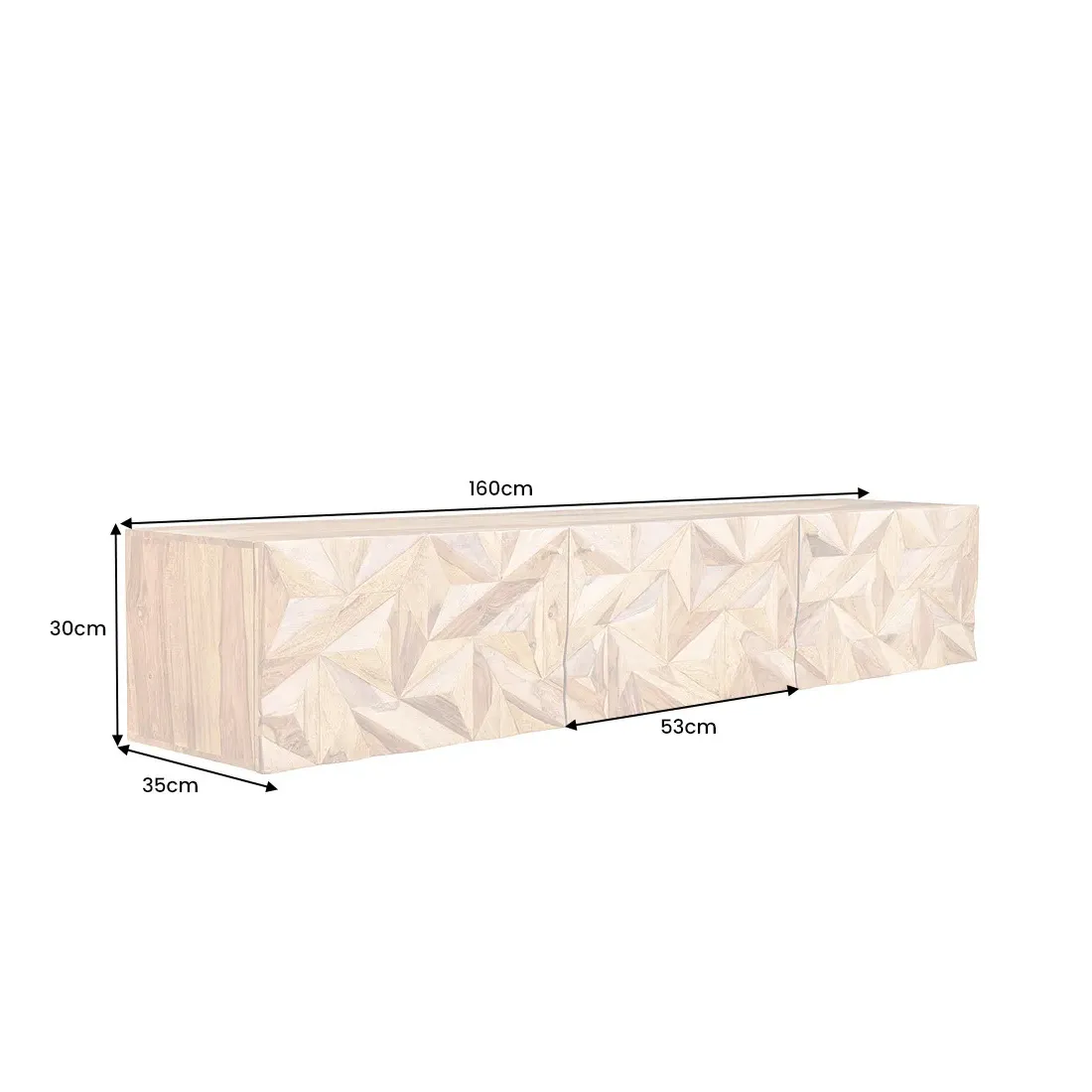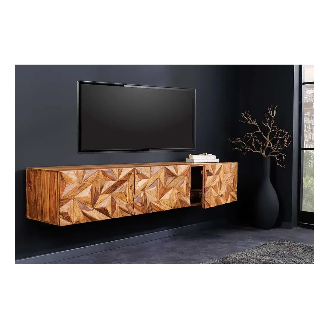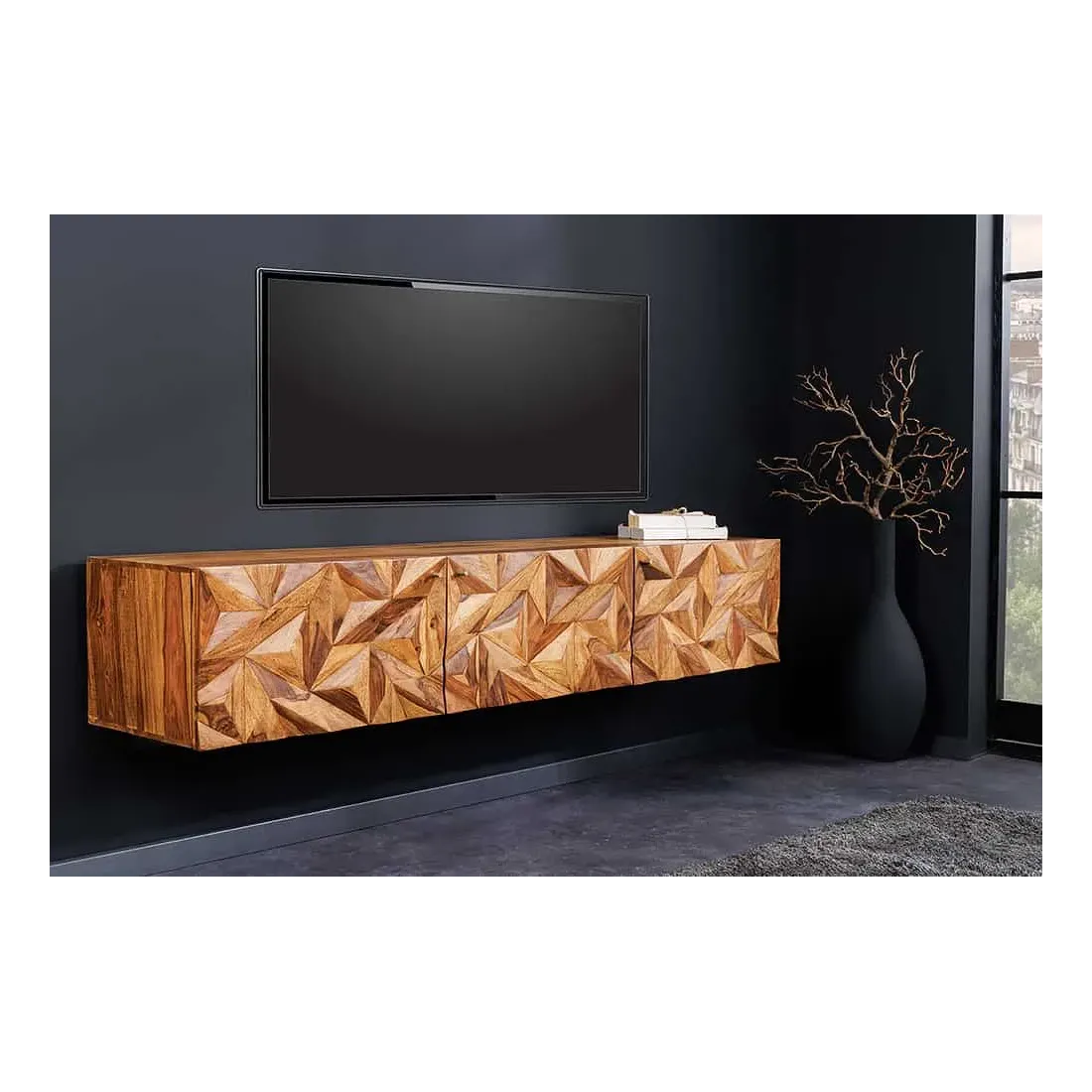 Meuble TV suspendu en bois massif Sheesham 160 cm – Design 3D artisanal & poignées doré mat