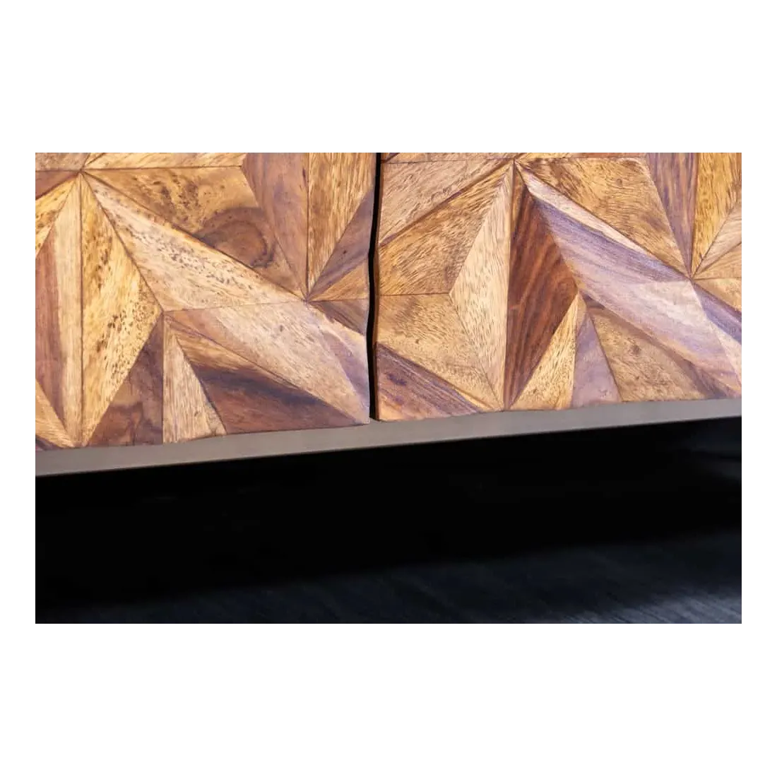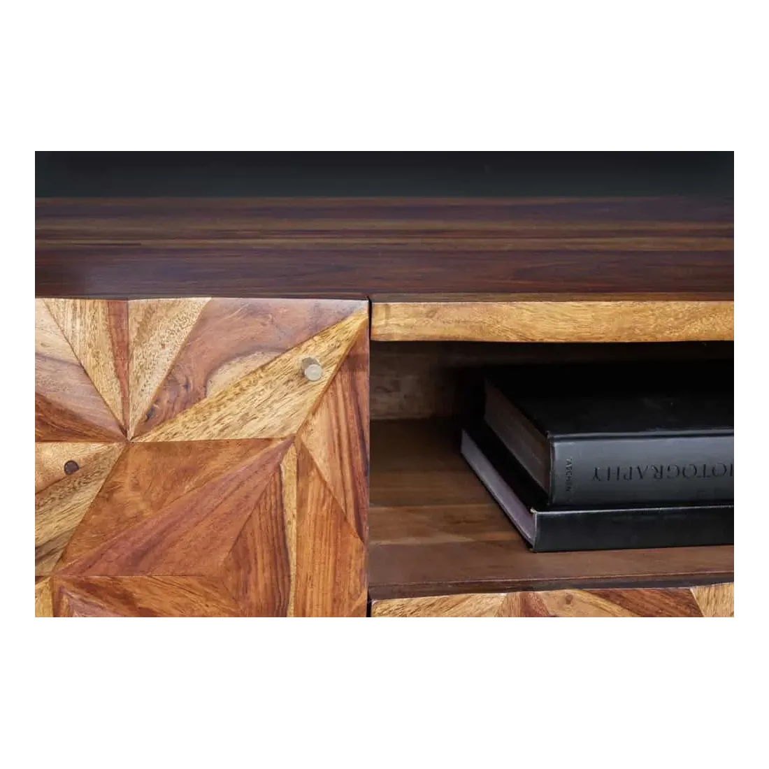 Meuble TV en bois massif Sheesham 160 cm – Design 3D artisanal & pieds doré mat