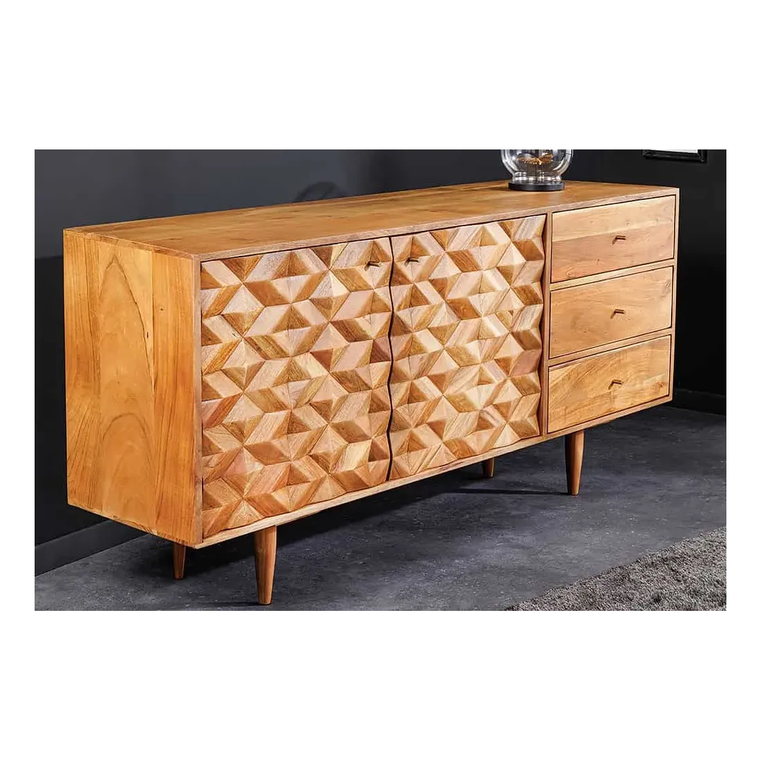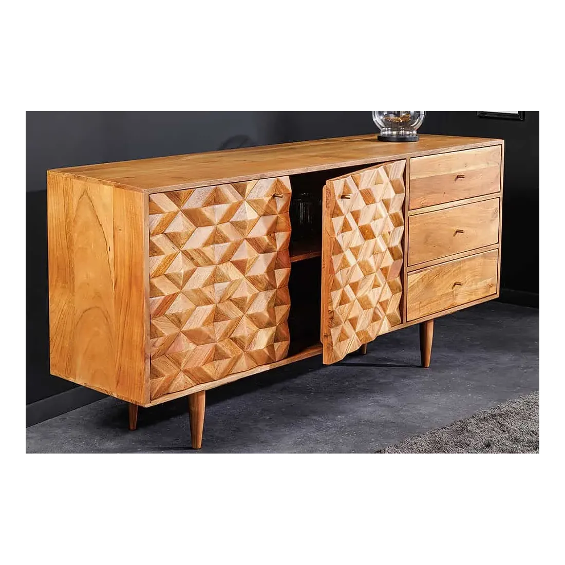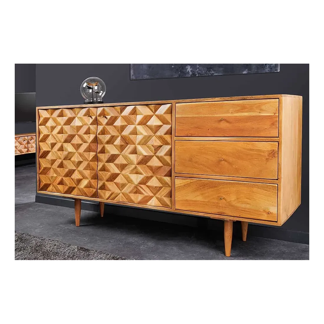 La surface 3D travaillée artisanalement donne à ce buffet un relief expressif et unique, mettant en valeur la texture naturelle du bois. La finition miel vernie accentue ses nuances chaudes et dorées, rendant chaque meuble distinctif.