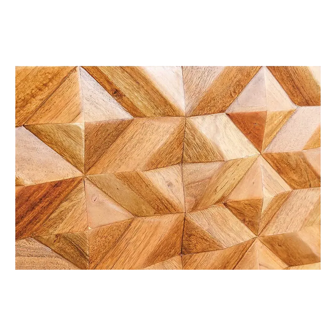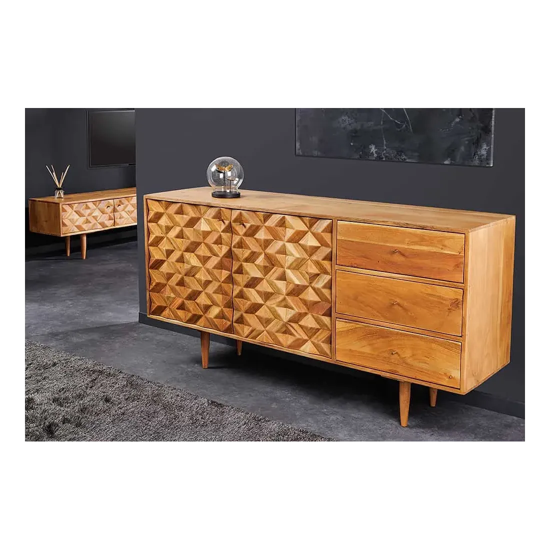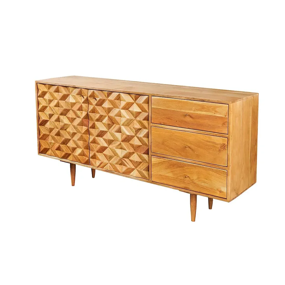 La surface 3D travaillée artisanalement donne à ce buffet un relief expressif et unique, mettant en valeur la texture naturelle du bois. La finition miel vernie accentue ses nuances chaudes et dorées, rendant chaque meuble distinctif.