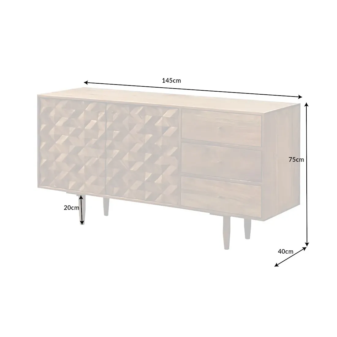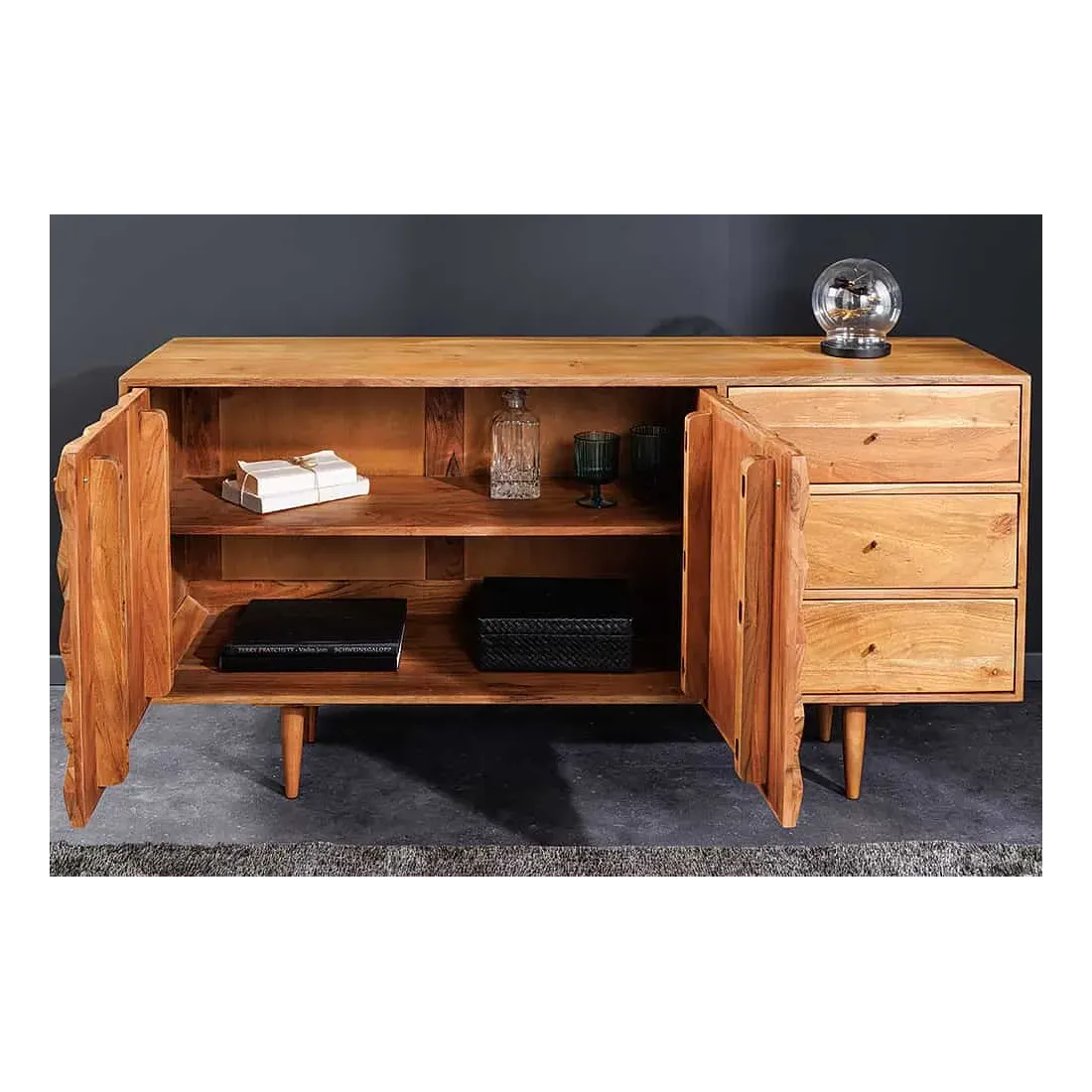 Le buffet ALPINE 145 cm est un meuble unique en bois massif d'acacia, sublimé par une finition miel vernie qui fait ressortir le veinage noble du bois. Avec ses 3 tiroirs et 2 grands compartiments, il offre un espace de rangement généreux. Ses poignées dorées mat et sa surface 3D sculptée à la main en font une pièce de caractère, parfaite pour un intérieur au style rétro ou moderne.