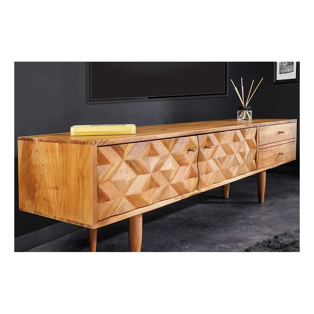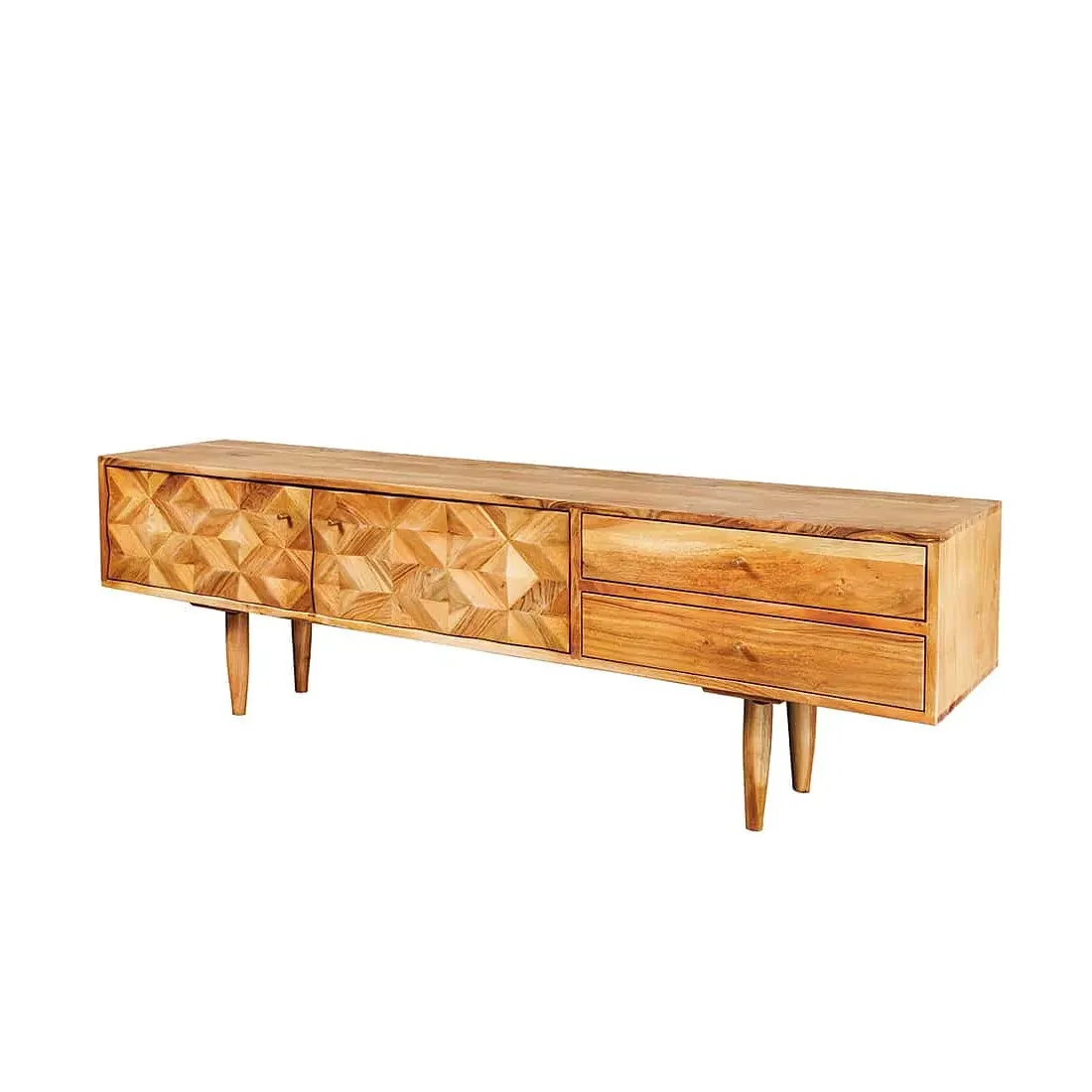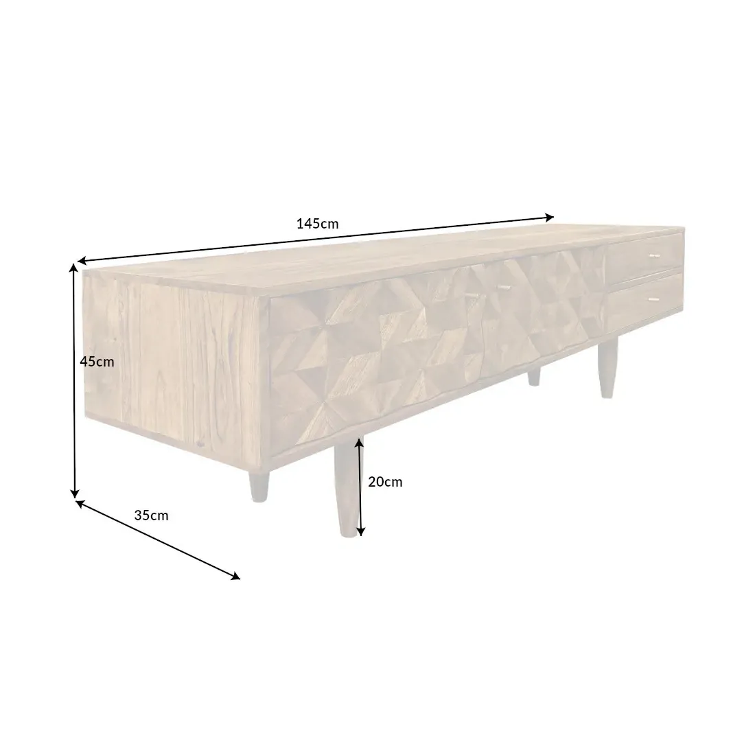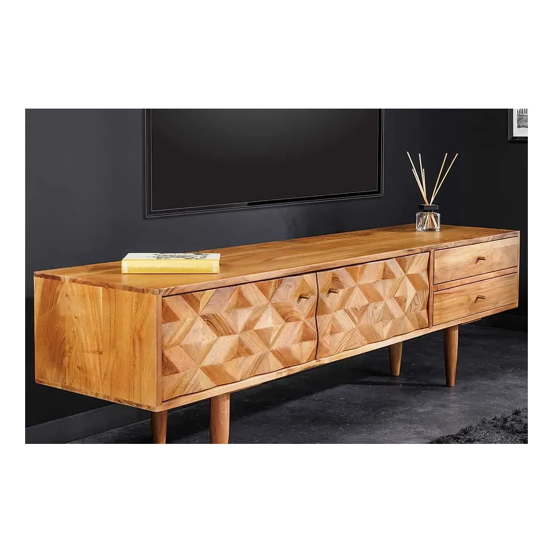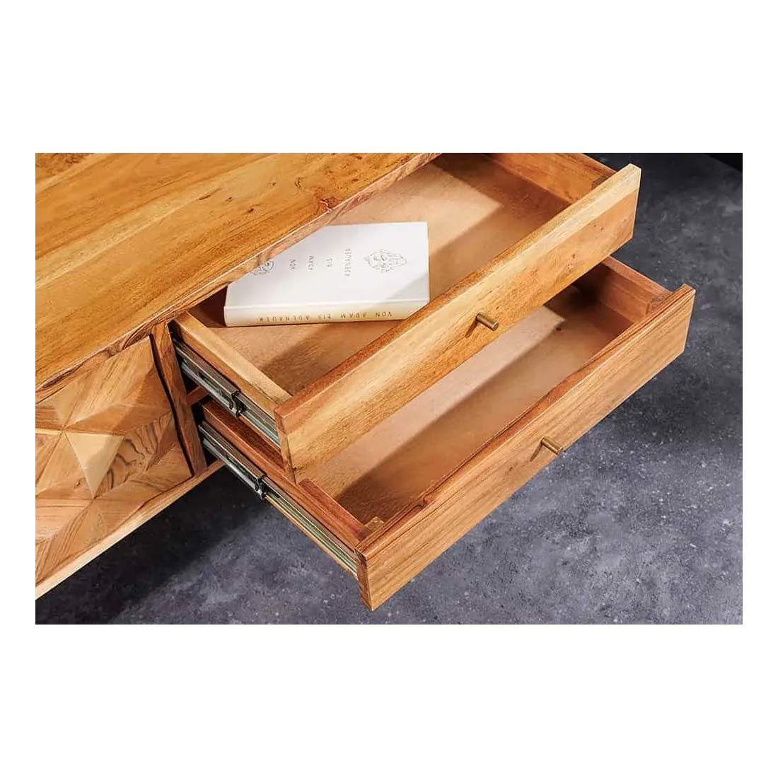 Le TV-Lowboard ALPINE 145 cm associe le charme du bois massif d'acacia avec une finition miel vernie qui met en valeur ses veines naturelles. Son design rétro est sublimé par des poignées dorées mates et une surface sculptée en 3D à la main. Avec ses tiroirs, ses niches ouvertes et ses pieds hauts en métal, il allie style et fonctionnalité.
