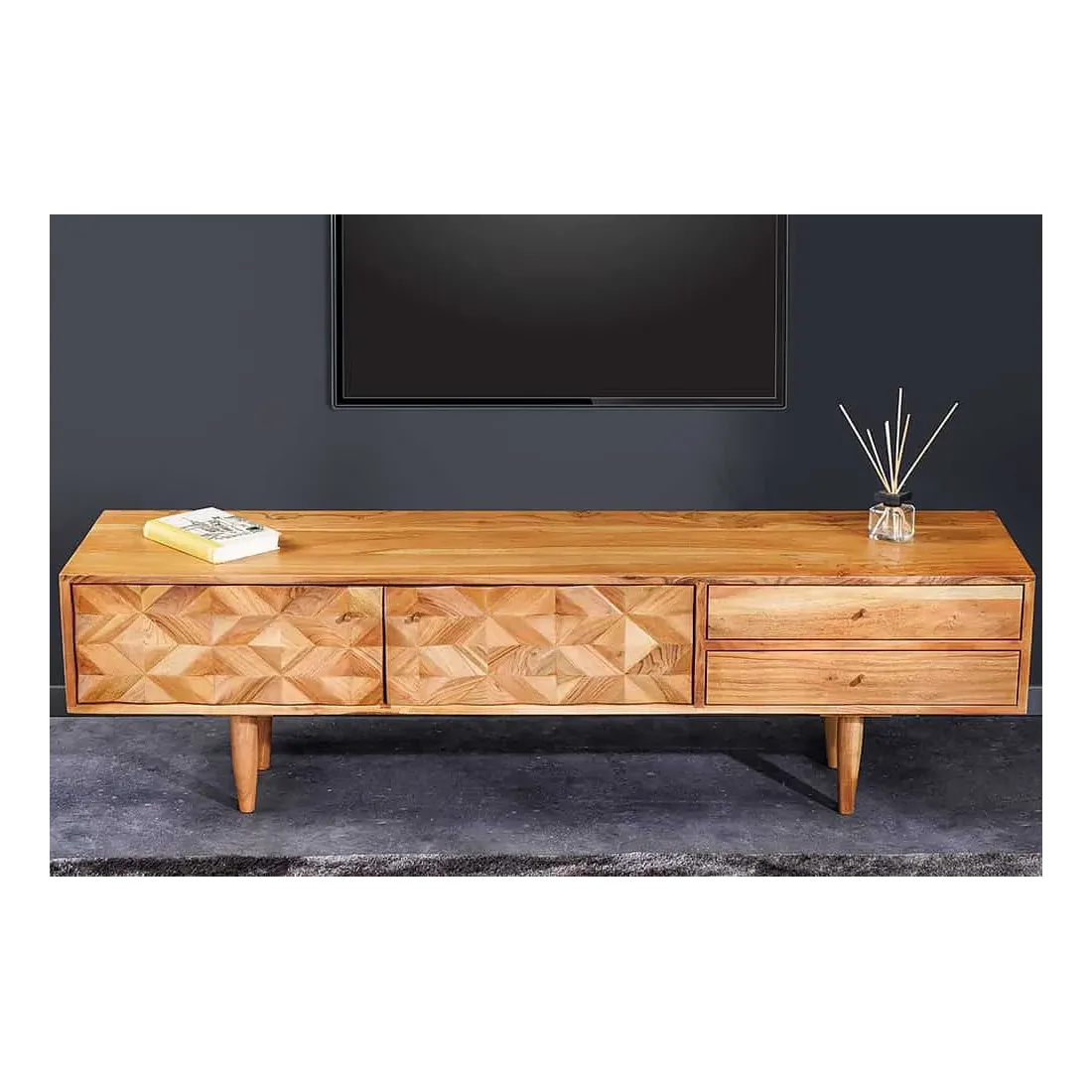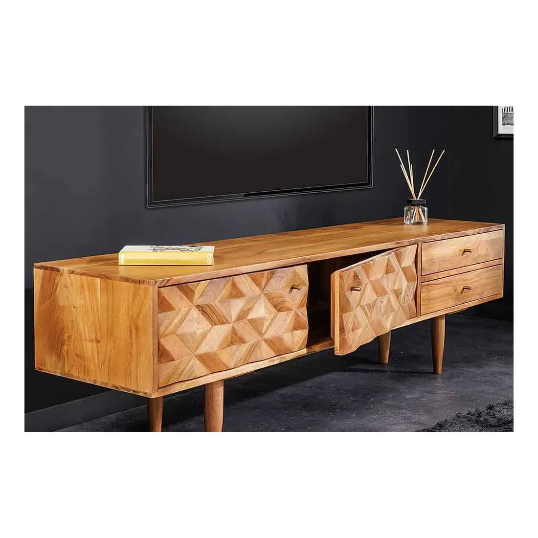 Meuble TV en bois massif d’acacia 145 cm – Finition miel rétro avec poignées dorées