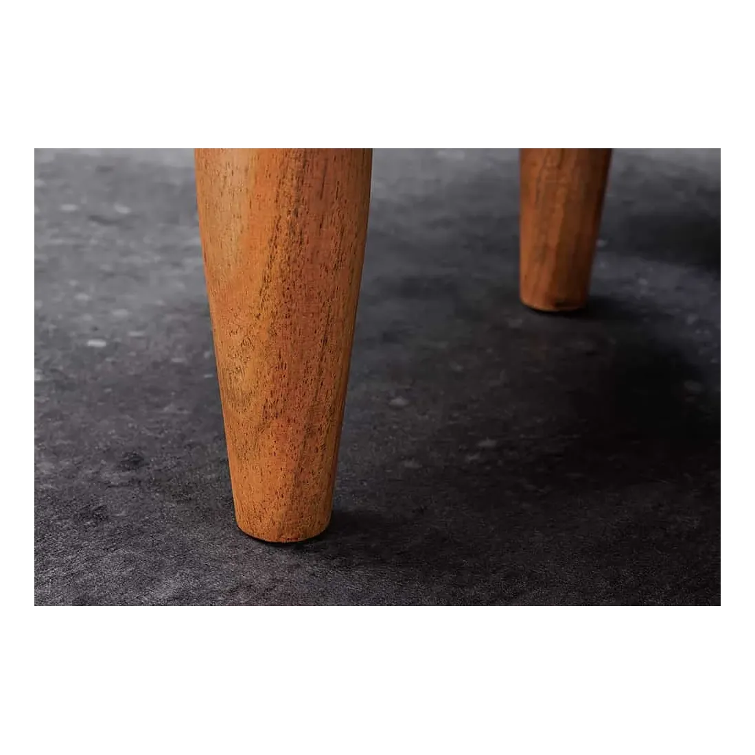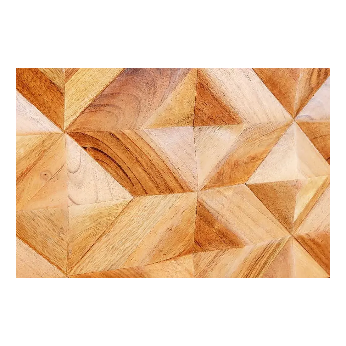 La surface 3D façonnée artisanalement donne un effet sculptural unique, rendant chaque pièce exclusive. La finition miel vernie intensifie la profondeur des nuances naturelles du bois et protège durablement la surface.