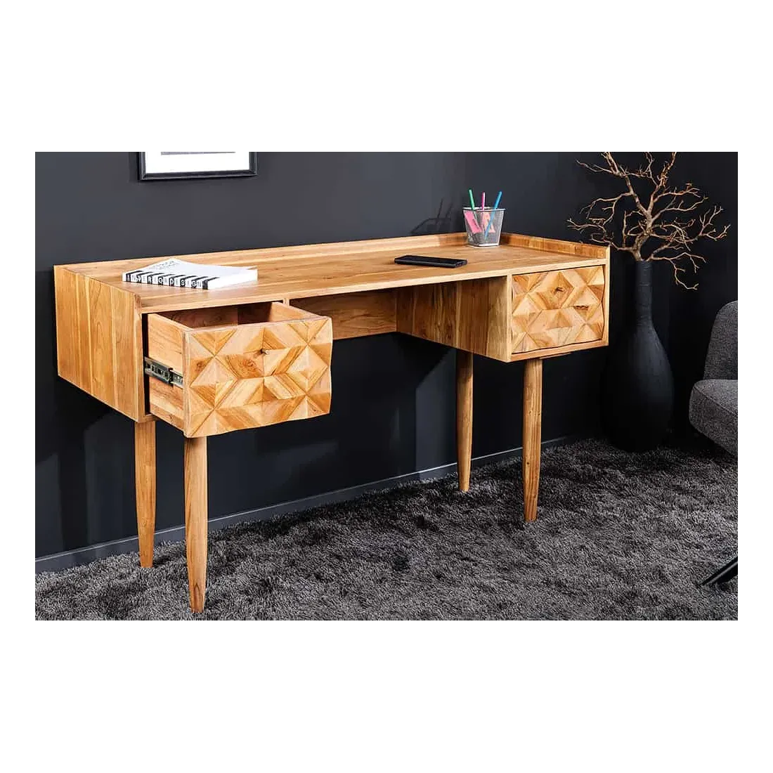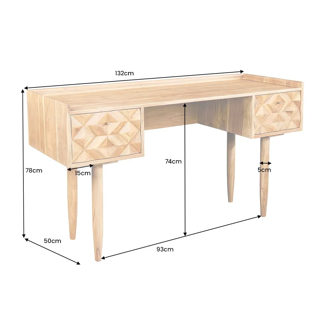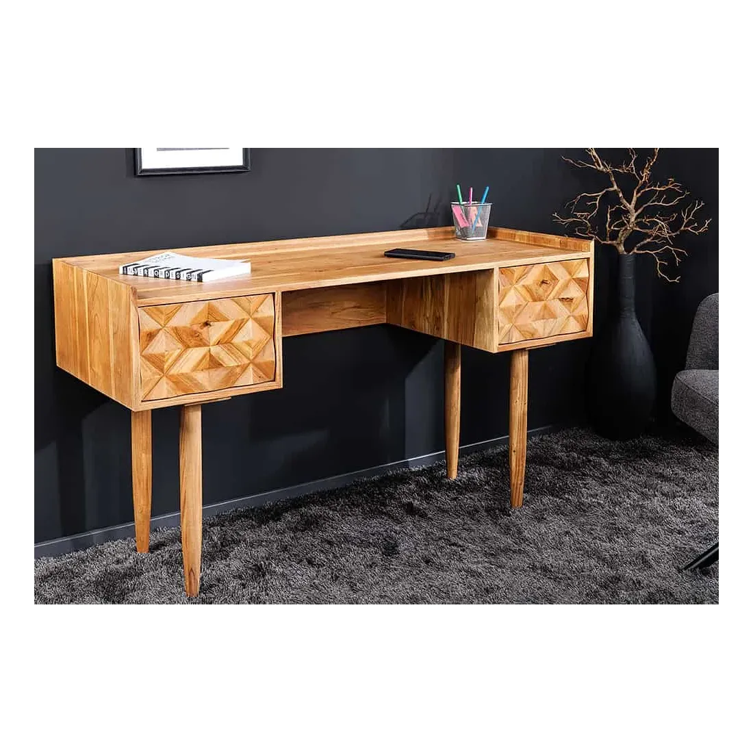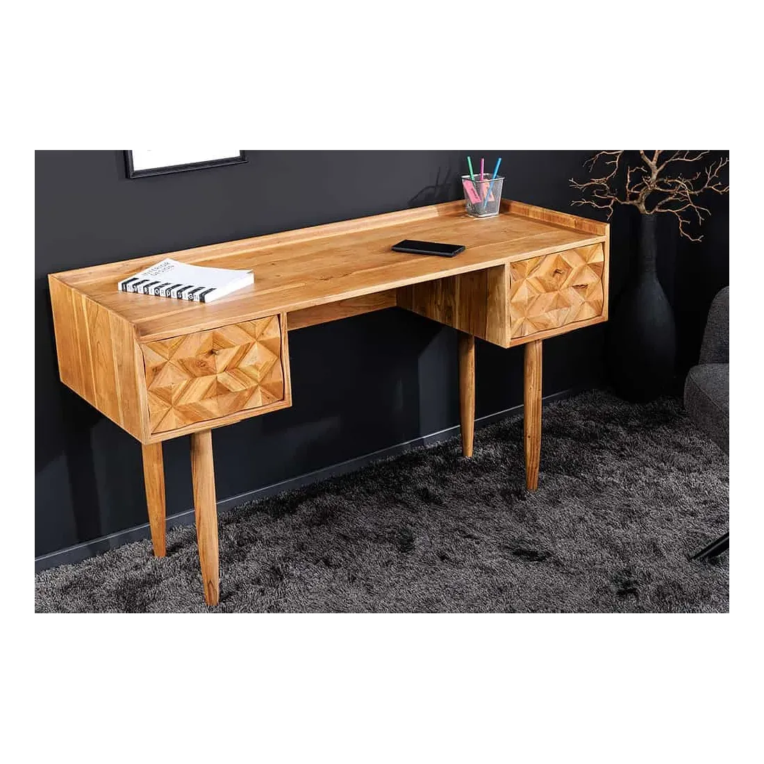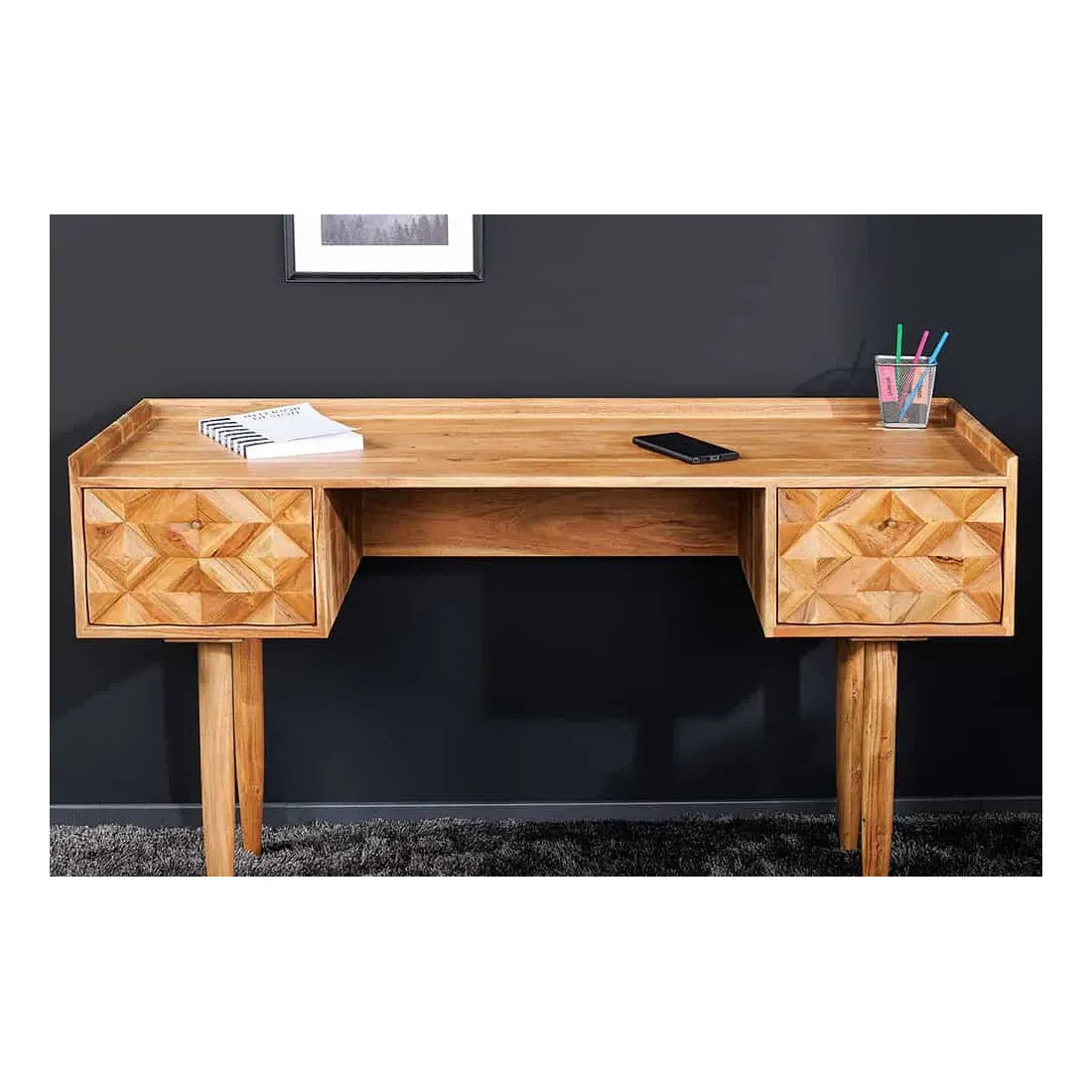 Le bureau ALPINE 135 cm séduit par sa structure en bois massif d'acacia, sa façade 3D sculptée à la main et sa finition miel raffinée. Ses deux tiroirs spacieux permettent de ranger vos documents et accessoires de bureau, tout en apportant une touche naturelle et élégante à votre intérieur.