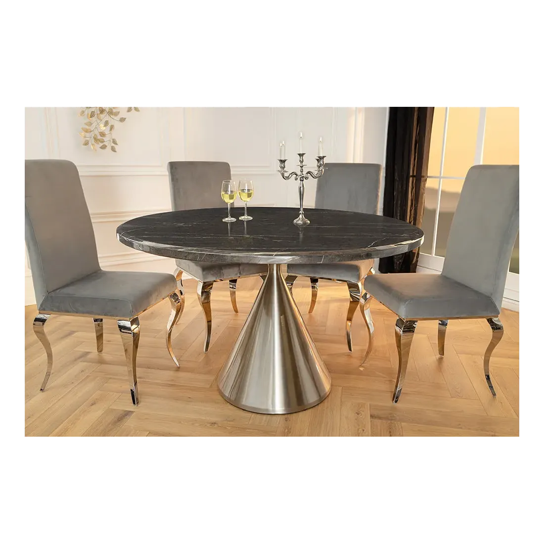 La table à manger ronde ELEGANCIA (Ø 130 cm) est une pièce design au style luxueux et intemporel. Son plateau en gussmarmor noir poli se distingue par sa surface brillante et facile d’entretien, tandis que son pied central en acier chromé brossé apporte stabilité et modernité. Parfaite pour accueillir vos convives avec élégance.