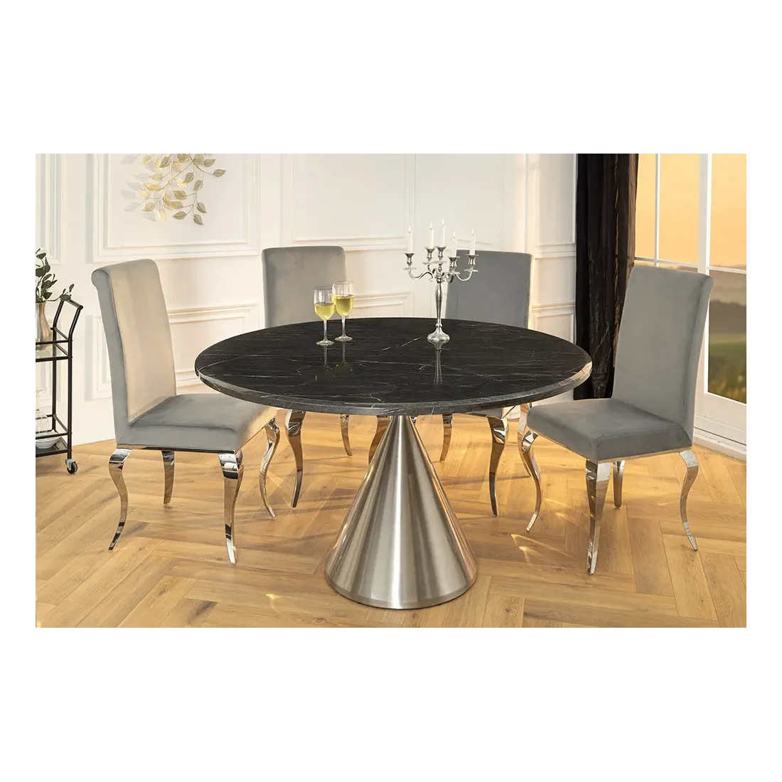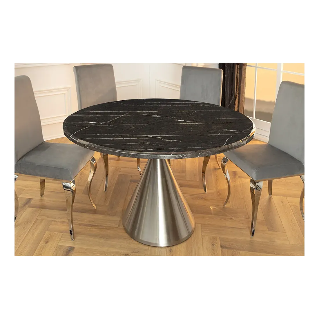 Table ronde ELEGANCIA 130 cm – Plateau en marbre noir et pied colonne en acier chromé