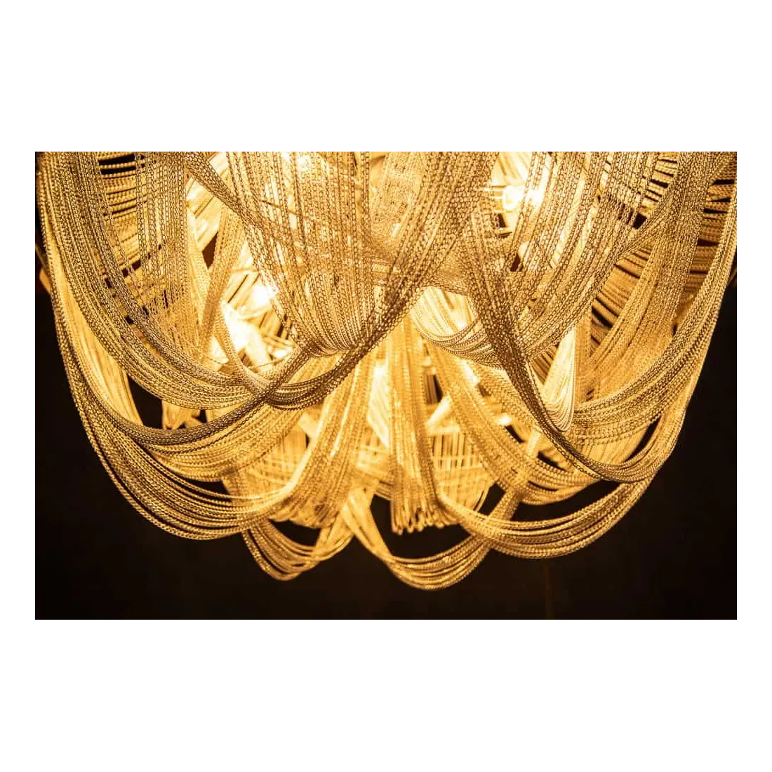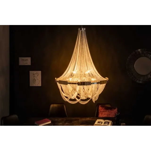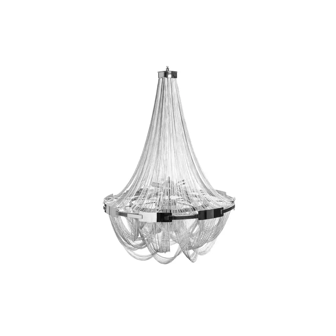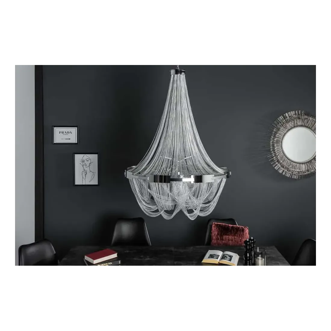 Conçu en aluminium argenté de haute qualité, il impressionne par son abat-jour unique composé de fines chaînes métalliques qui diffusent un jeu de lumière spectaculaire.